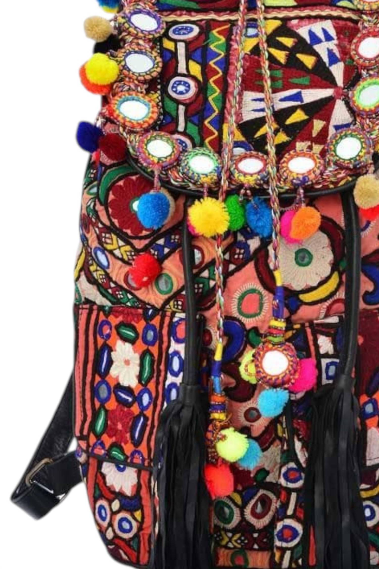 Not only functional, this backpack is stylish and fits everything you need in one place. It's a win-win! Introducing the Nairobi Banjara Backpack by Guadalupe Design, a statement piece in vibrant multicolor boasting unique craftsmanship. This backpack features intricate mirror motifs, fringe, stitching, and pom pom detailing, complemented by refined leather accents. Measuring 20 inches in height and 14 inches in width, it offers ample space while ensuring comfort and style. The interior is lined for added durability, making it a practical yet stylish choice.