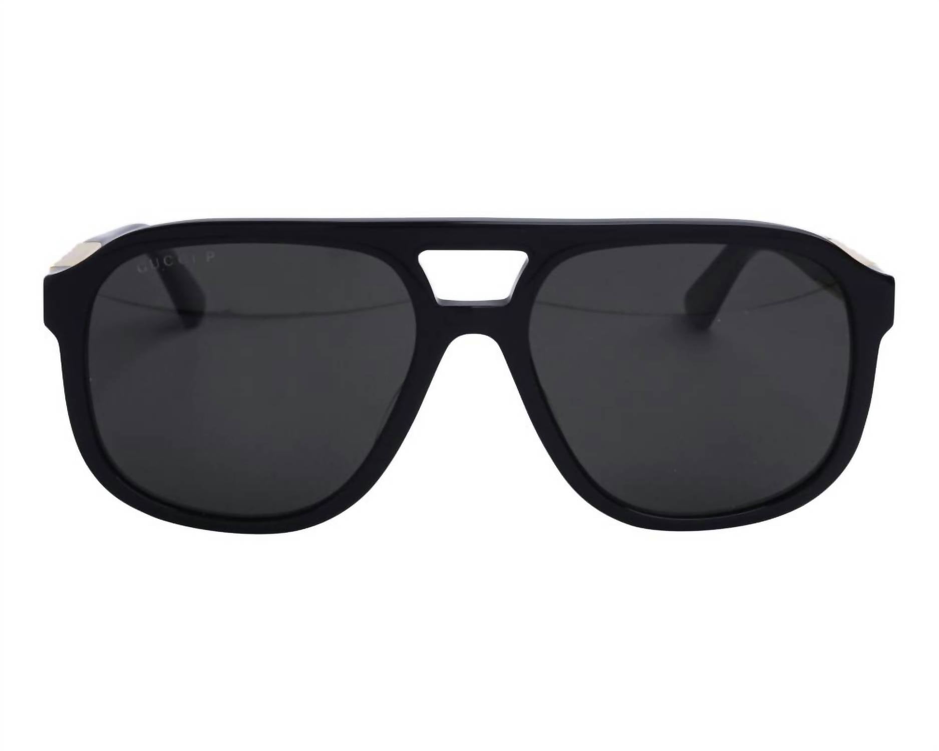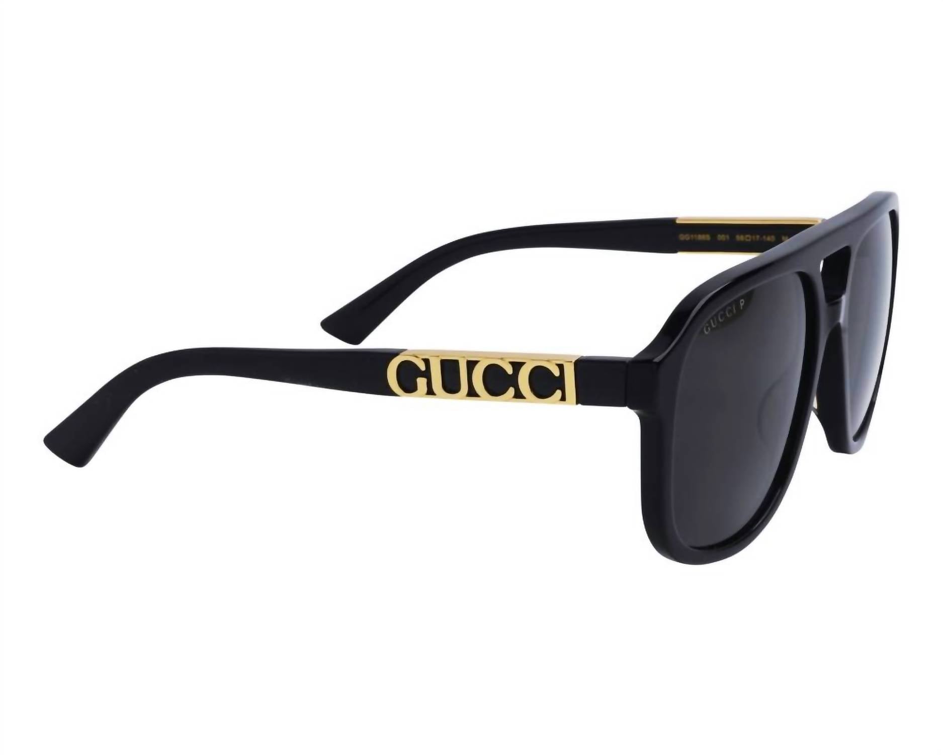 Introducing the Unisex GG1188S Sunglasses by Gucci, where iconic design meets cutting-edge functionality. These full-rim aviator sunglasses are crafted from high-quality acetate and made in Italy, ensuring both durability and luxury. Frame Color: Shiny Black. Lens: Grey Polarised. Lens Width: 58mm, Lens Height: 49mm, Bridge Size: 17mm, Temple Length: 140mm. Perfectly blending style and performance for the fashion-forward individual.