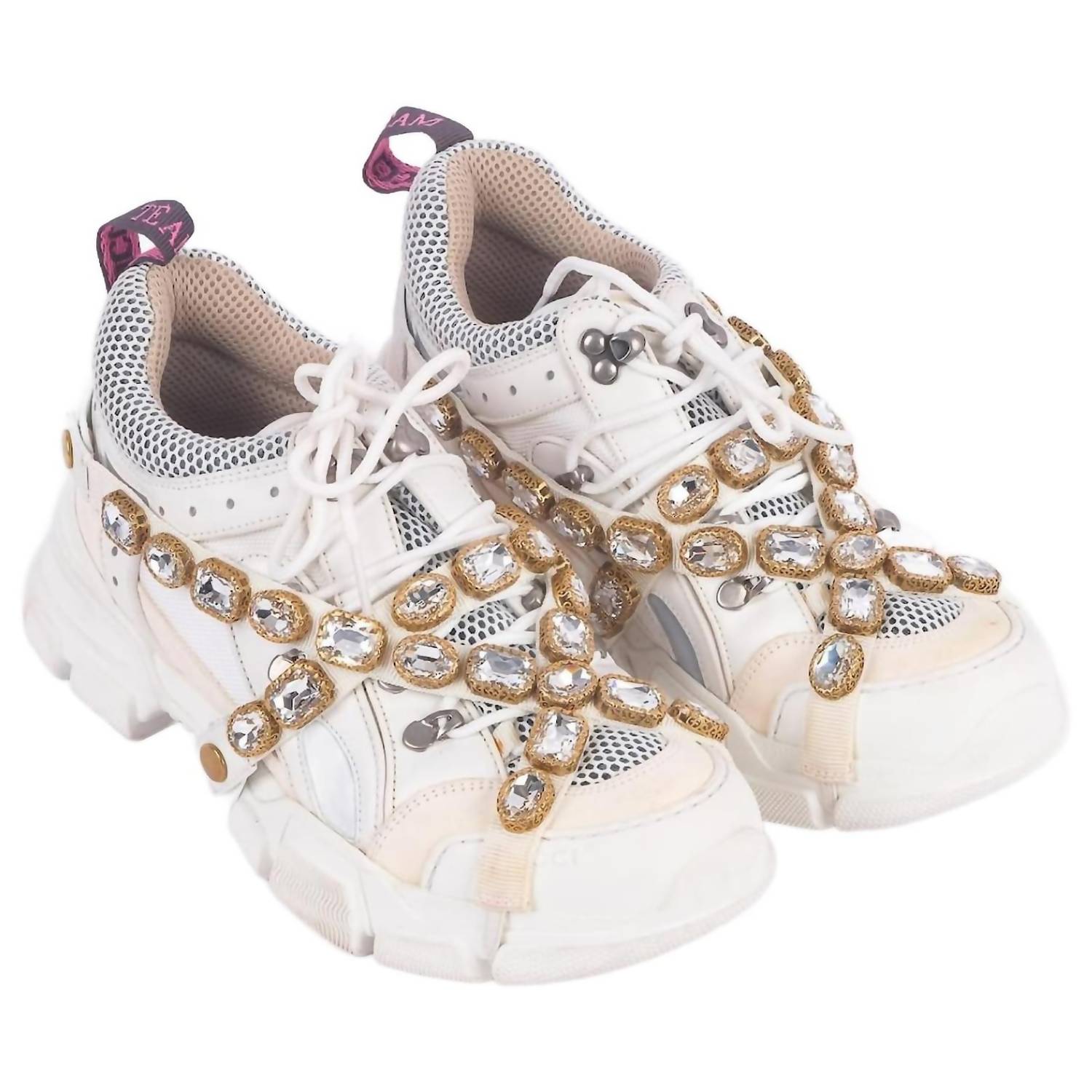 When fashion and function come together seamlessly. Step into bold, fashion-forward style with these statement trainers that fuse luxury and adventure. Crafted from a blend of leather and mesh, they feature a rugged, hiking-inspired silhouette elevated by a removable strass band adorned with crystals set in gold-tone metal. Breathable mesh panels enhance comfort, while the structured design offers both durability and standout appeal. Finished in good condition, these sneakers bring a striking edge to any casual or streetwear ensemble.