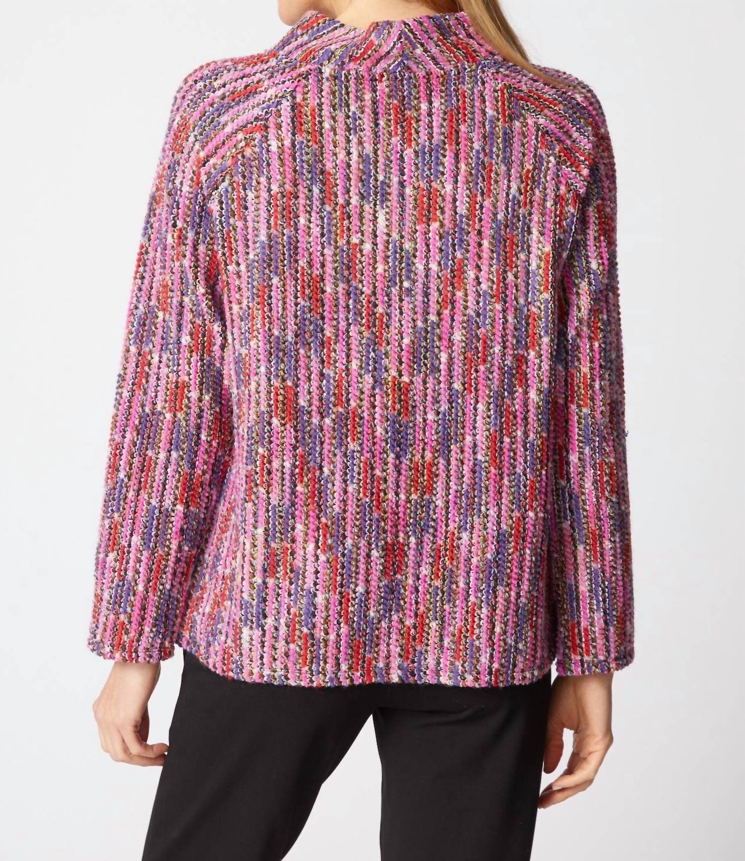 A classic fit that works just as good buttoned as it does left open. Introducing the Mosaic Knit Cambridge Pullover by Habitat, a colorful and textured piece designed to effortlessly complement any wardrobe. With its long raglan sleeves and mock neck, this pullover showcases vibrant boucle yarns in a relaxed fit. Composition: 57% Acrylic, 43% Polyester. Length: 24" in front and 23.5" in back for size small. Closure: Pull on. Care: Machine wash cold with like colors, tumble dry low, and cool iron if necessary. Perfect for travel, this cardigan features practical front pockets and a maximalist design, ideal for the fall season. Model is 5’9” wearing a size small.