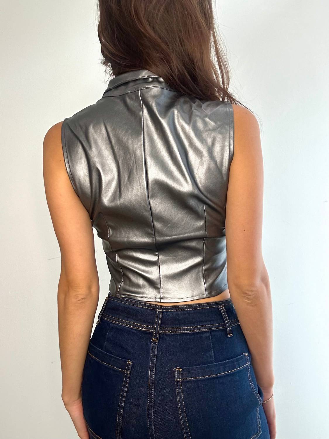 That extra layering piece you didn't know you needed! Step into the 90s-inspired scene with the Metal Muse Top by Hallelu, a perfect concert and Halloween pick in striking solid Gun Metal. This sleeveless, faux leather corset top features a stylish collar and a practical front zip closure. Composition: 55% PU, 45% Polyester. Unlined for a lightweight feel, this piece seamlessly pairs with any summer ensemble.
