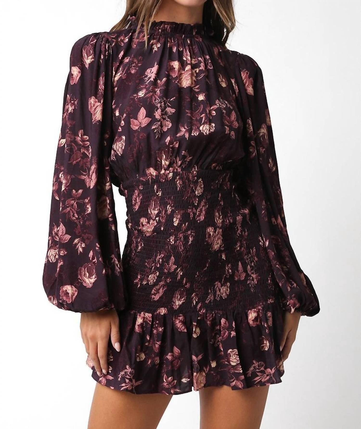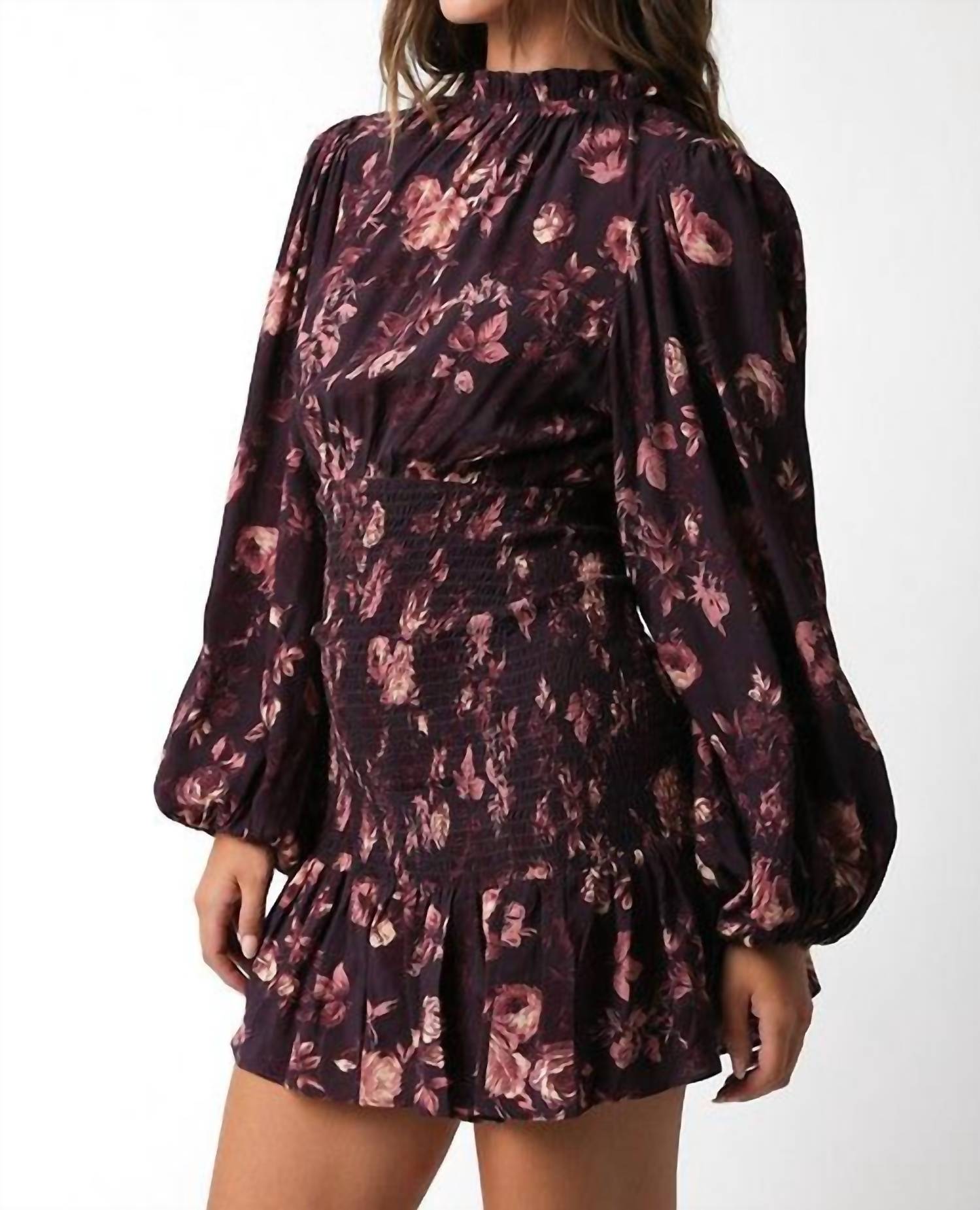 The kind of easy and flattering dress you'll be reaching for all season long. Introducing the Whimsical Bloom Dress by Hallelu, an enchanting piece perfect for a summer beach day or Thanksgiving gathering. This mini dress, styled in a rich Eggplant hue with a floral pattern, features long puff sleeves and a smocked waist for a flattering A-line silhouette. Composition: Viscose Blend. Closure: Zip closure. Care instructions not specified. Embrace boho chic with its elegant mockneck design.