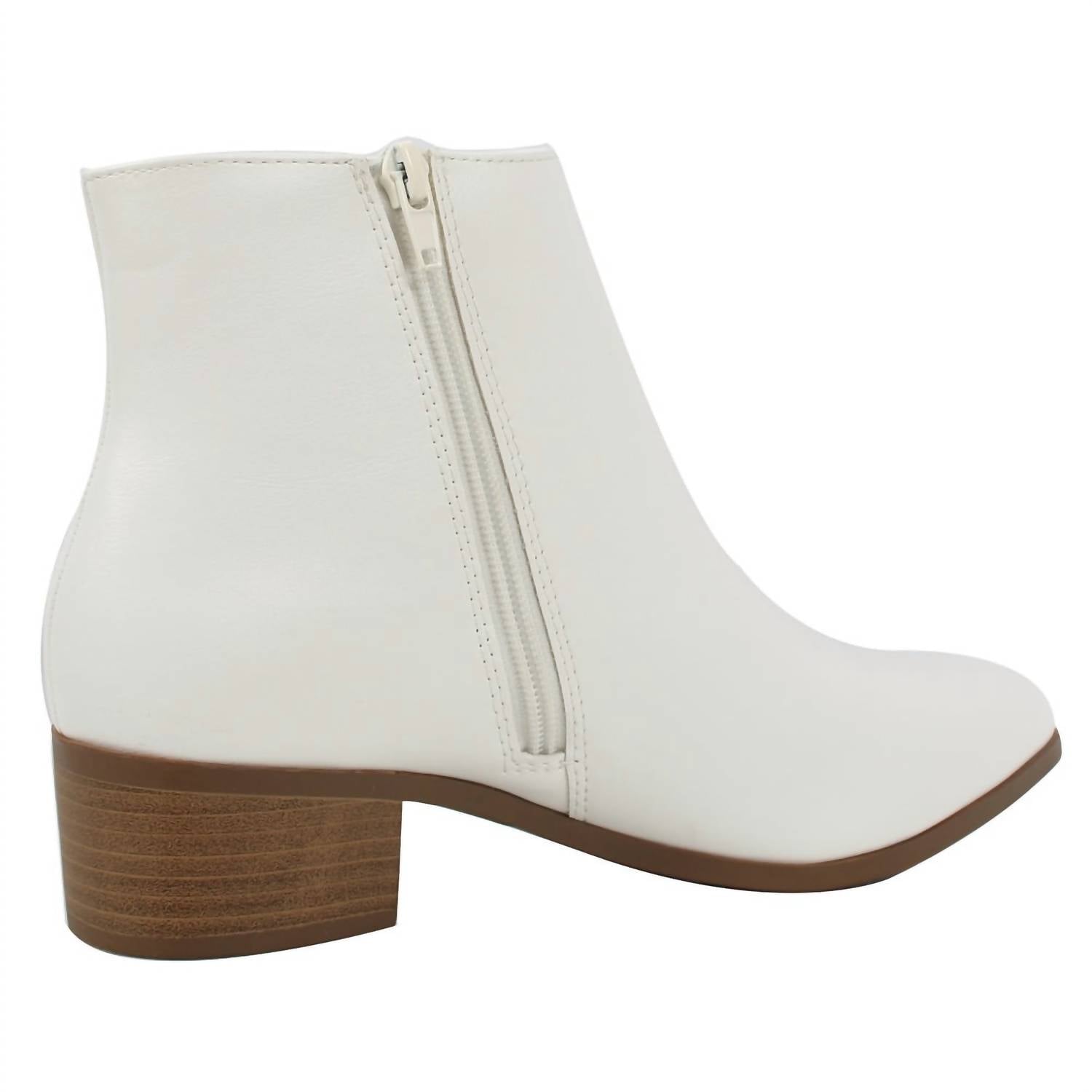 Say hello to the perfect, most versatile boot. The ankle height makes this style easily transition from day to night. Wear them with your favorite skinny jeans and tee for a more laid back look, or pair them with your favorite mini dress and jacket for a night out on the town. Meet the Women's Kimbo Booties by Hallelu, a chic addition to any wardrobe with their preppy, neutral design in white. Made from durable faux leather, these booties are perfect for a summer concert or Easter outing. Featuring a stylish pointed toe and comfortable block heel, they ensure both flair and functionality. The convenient side zipper closure adds a practical touch for easy wear, making these ankle booties a versatile choice for any occasion.
