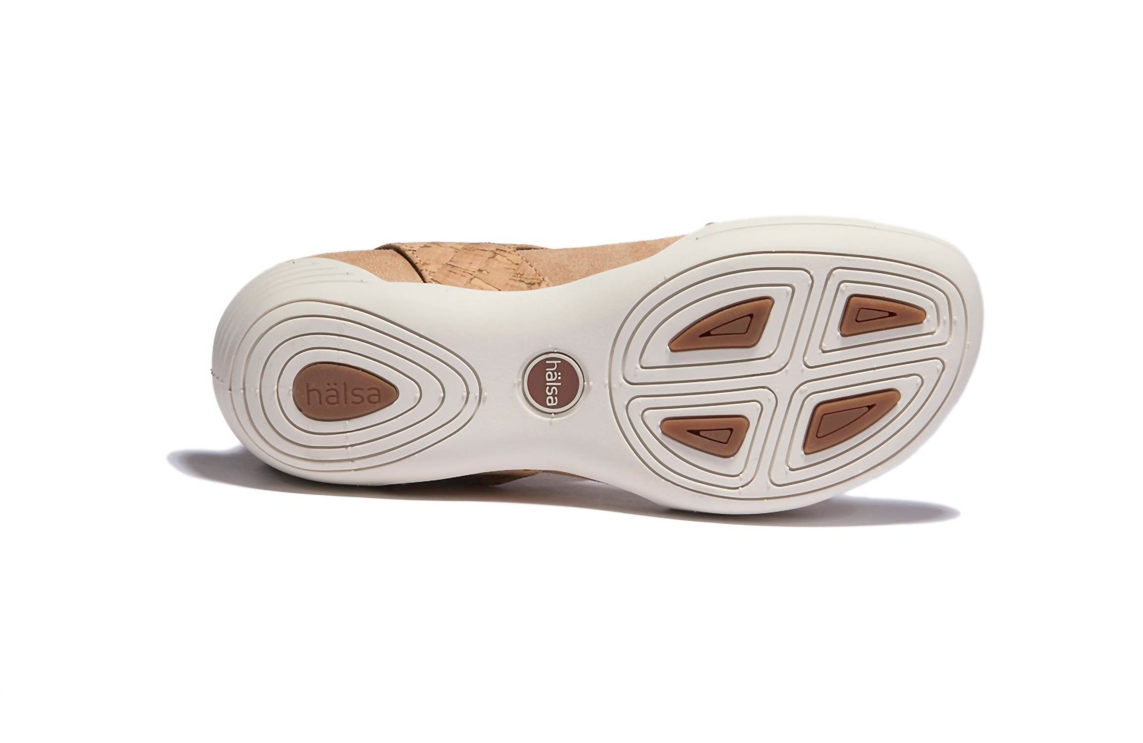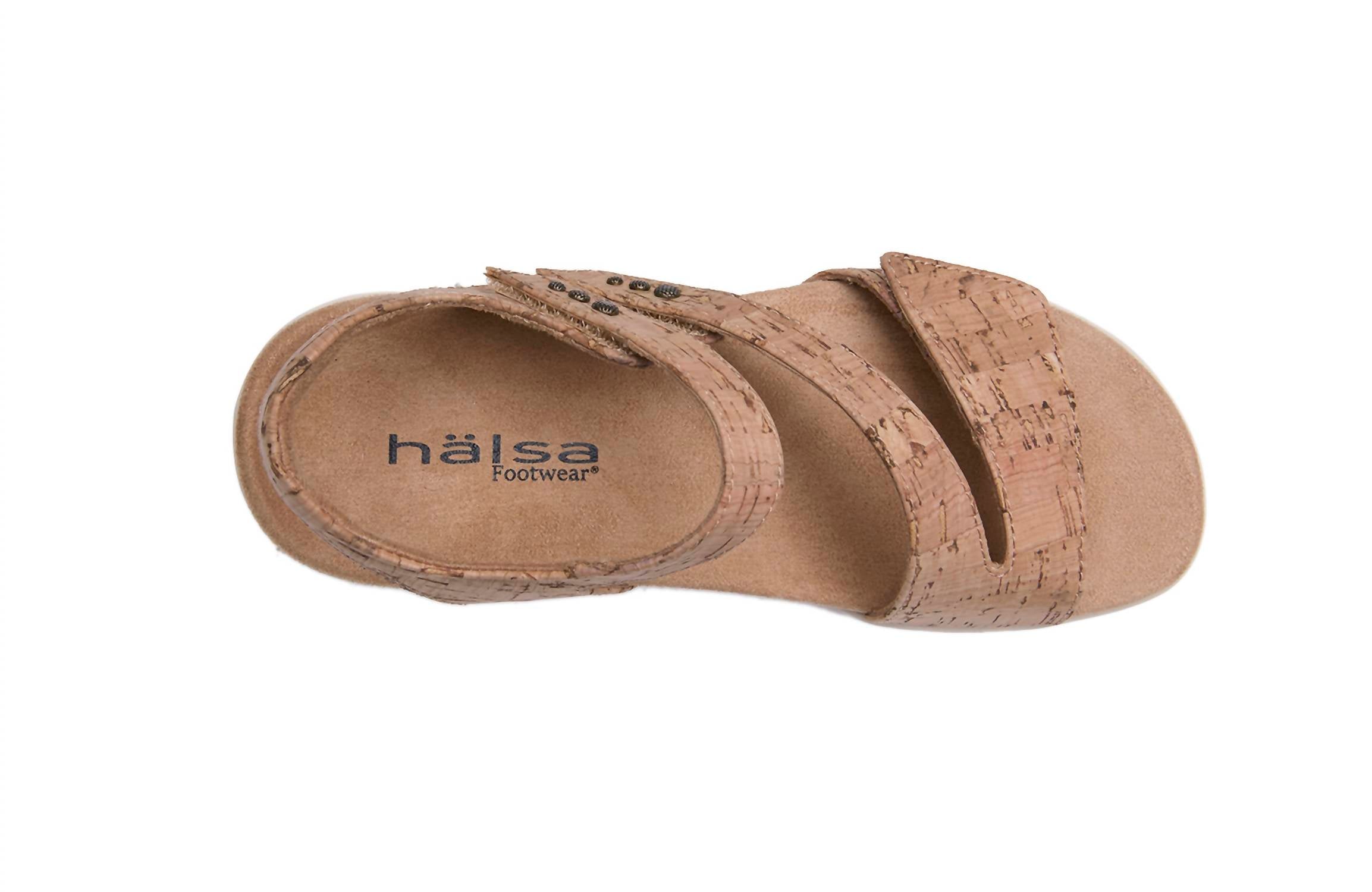Step into comfort and style with the Halsa Footwear Women's Denia Ankle Strap Sandal in a chic cork hue. Designed with adjustable hook-and-loop straps, these sandals offer a secure fit, while the 1 1/2" platform heel ensures all-day ease. Its leather upper is complemented by a cushioned EVA footbed with arch support and an antimicrobial finish to keep odors at bay. Imported and crafted for those sunny vacations, these sandals offer both practicality and elegance for any spring occasion.