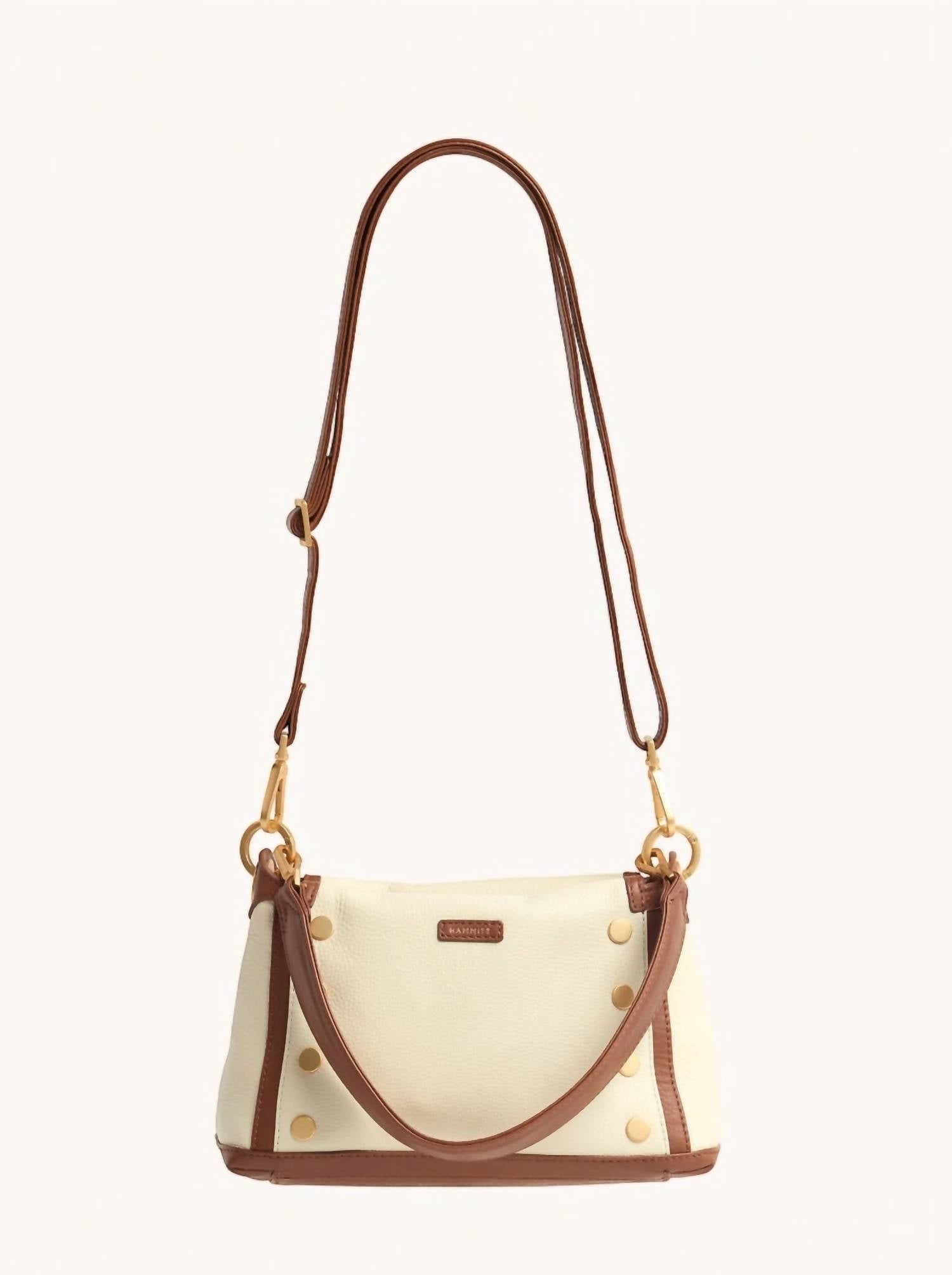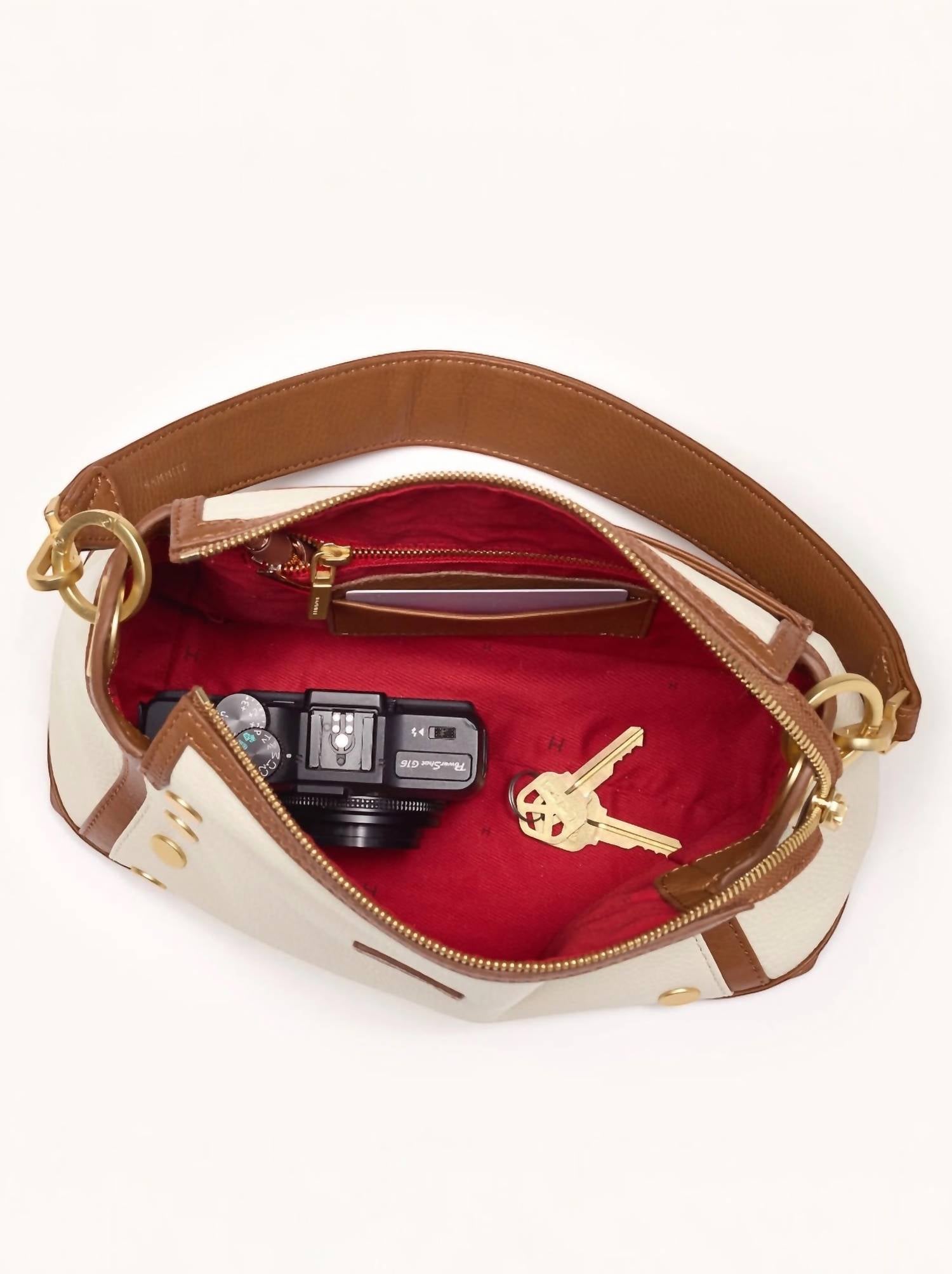 The crossbody bag is a trend that is here to stay and we especially love this style. Introducing the Bryant Med Courtyard Crossbody Bag by Hammitt, an elegant and functional accessory for your wardrobe. This versatile bag is crafted from soft pebbled leather in a neutral cream and warm medium brown color, complemented by brushed gold hardware. It features a red cotton twill lining, a handy back phone drop pocket, and interior organization with a credit card slot and zip pocket. With dimensions of 9" L x 5" W x 9.25" H, it can be worn as a crossbody or shoulder bag, thanks to removable and adjustable straps.