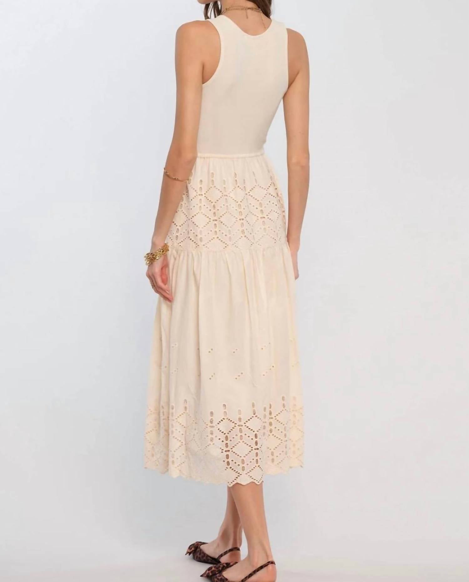 The perfect length dress does exist. The Aribella Midi Dress by Heartloom is a beige dream for your wardrobe, perfect for spring and dinner parties. This sleeveless, A-line dress features a slim-fitting bodice in a buttery soft ribbed knit and a super-special placed cotton eyelet skirt, creating a chic silhouette. Its composition is 32% Rayon, 30% Cotton, 30% Viscose, and 8% Spandex, with a pull-on closure for easy wear. With a length of 49.5 inches from the high point of the shoulder, it is machine washable for convenient care. Model is wearing size XS (5'9" height, 34" bust, 24" waist, 35" hips).