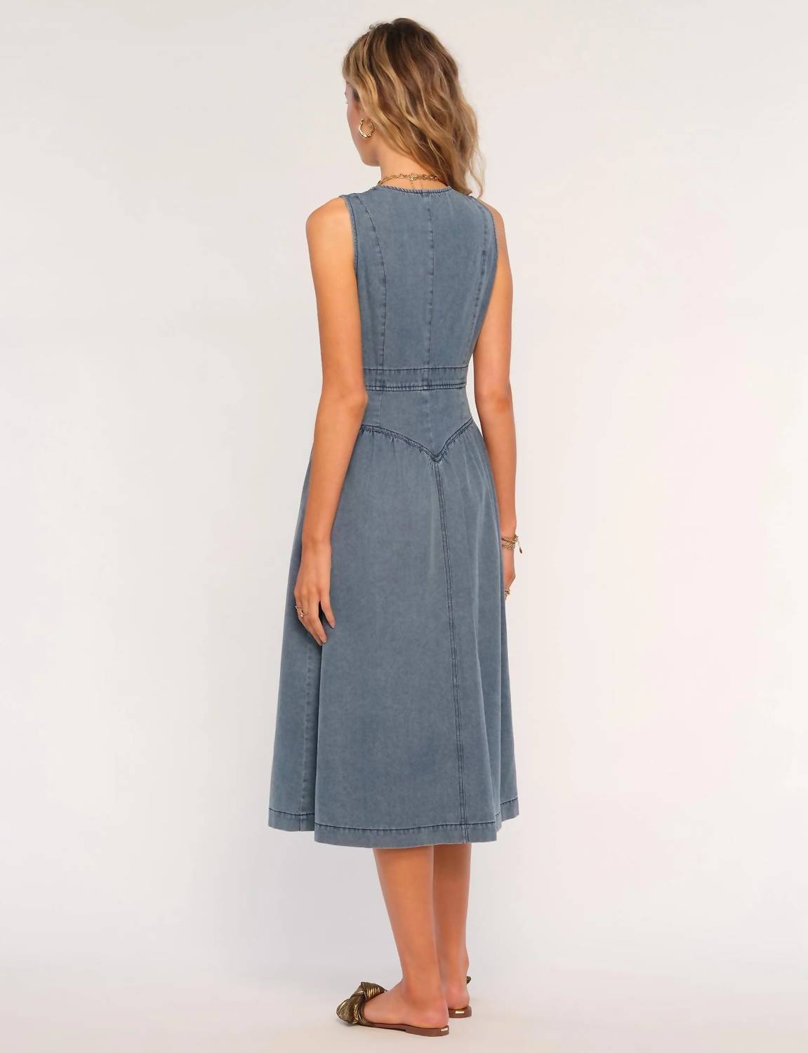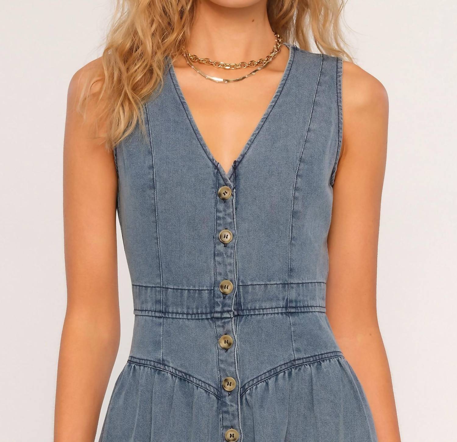 Just add slides or mules and you are good to go. Introducing the Heartloom Jaime Mini Dress, a charming choice for romantic dates or chic brunches. This A-line silhouette in soft denim features a V-neck and button closure for a touch of feminine allure. Made from a comfortable cotton blend, the dress boasts a flattering slim fit bodice with a full, flirty skirt that embodies quiet luxury.