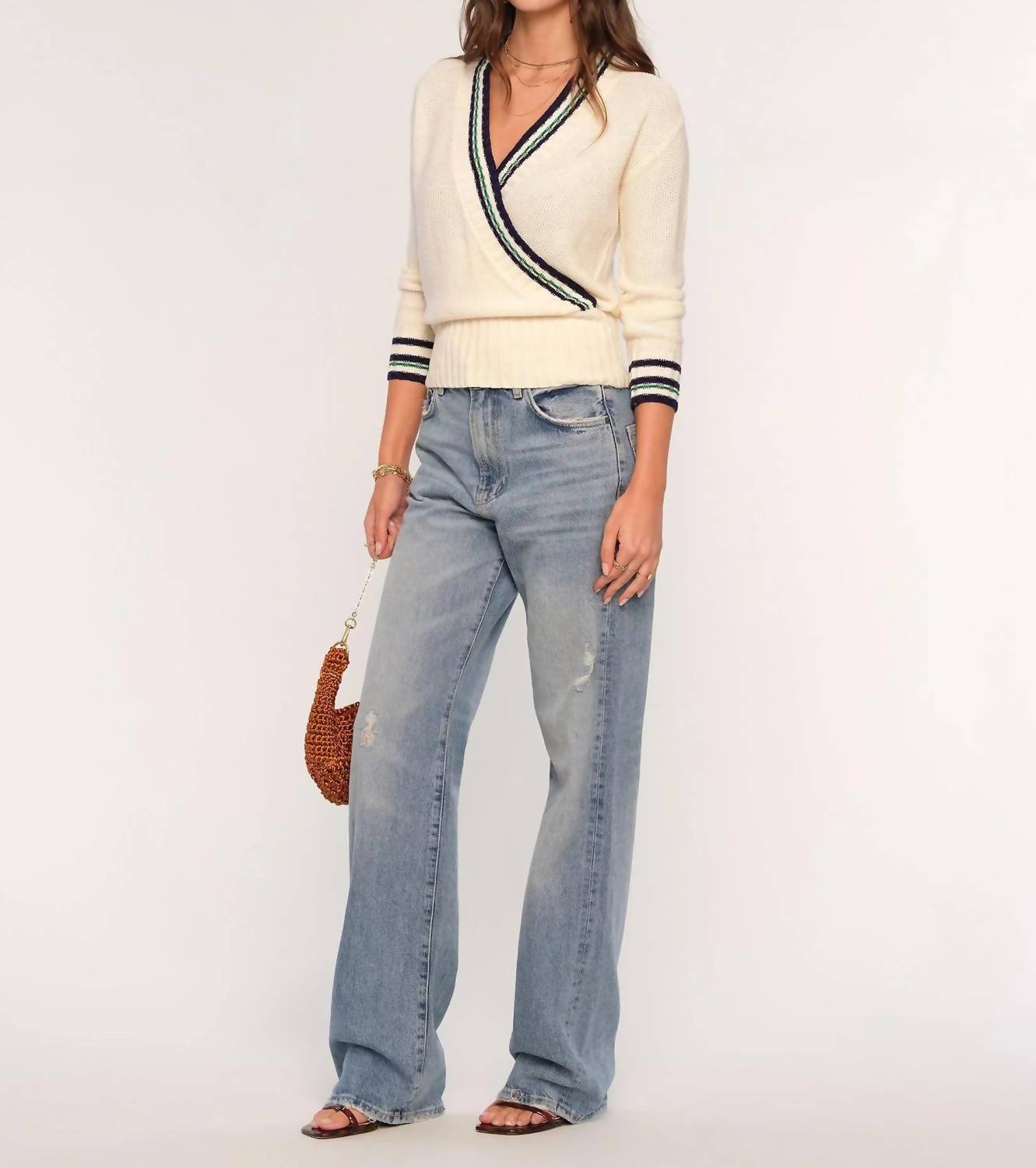 Wear this v-neck sweater with your favorite denim for the perfect fall look. Discover the Kian Sweater by Heartloom, a nostalgic nod to vintage varsity style with a feminine twist. This eggshell long sleeve sweater is crafted from a blend featuring 42% Polyester, 30% Acrylic, 20% Nylon, 6% Wool, and 2% Spandex, offering a soft melange knit with a textured pattern. Designed with a V-neckline, it features contrast striped tipping and a faux wrap front detail for added charm. Closure: Pull-on. Ideal for women seeking relaxed yet stylish winter wear.