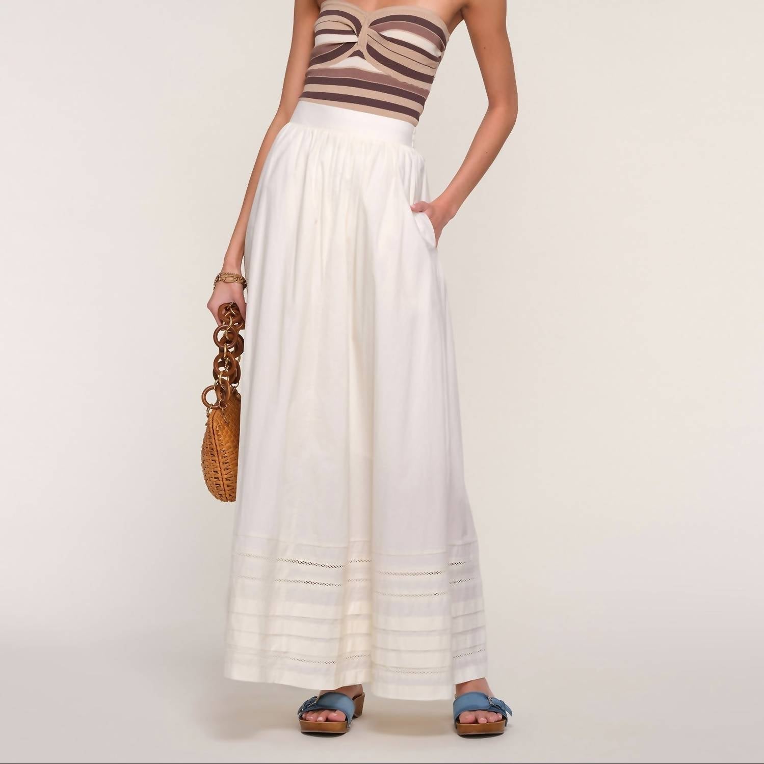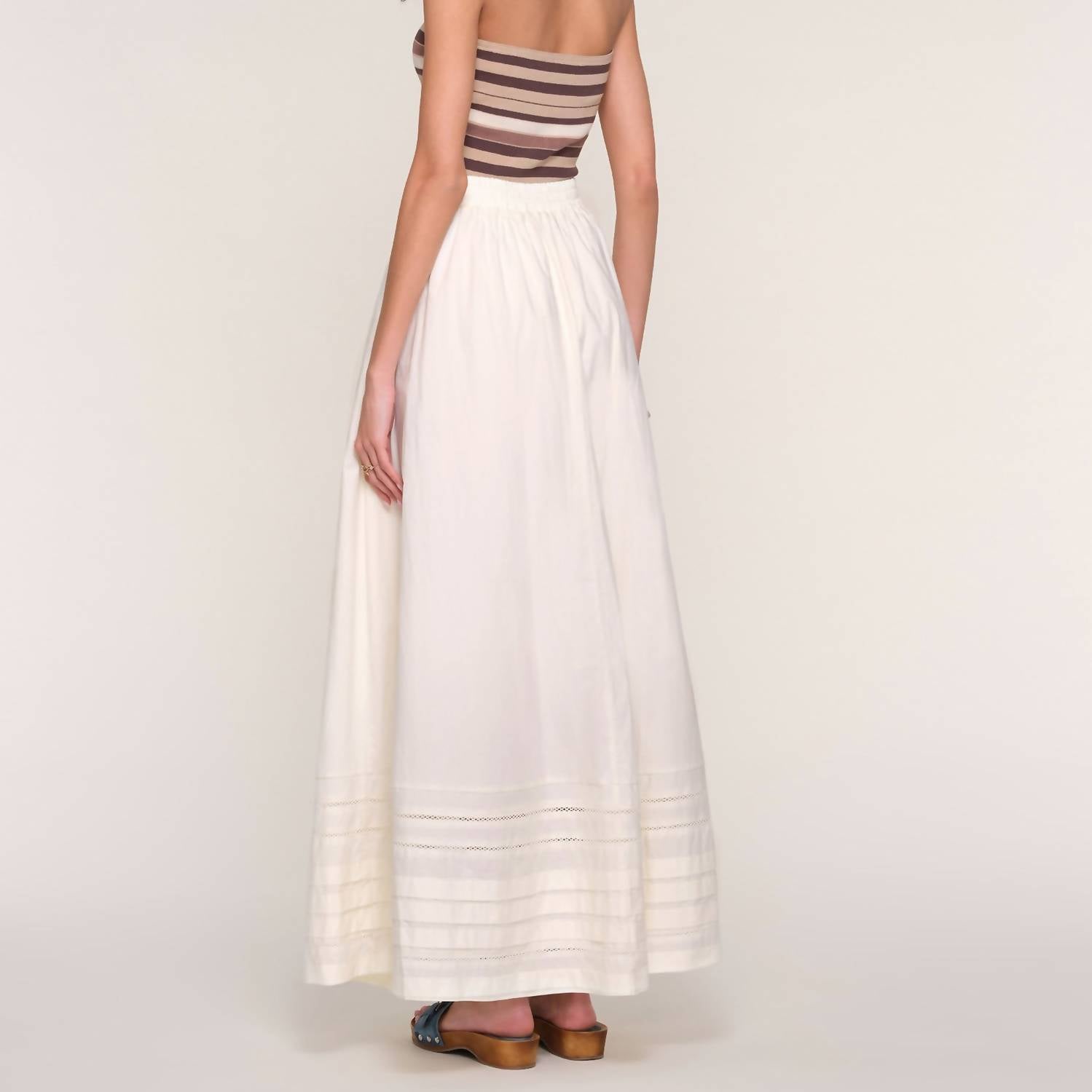 Flowy, comortable and stylish. This maxi skirt is a fan favorite. Experience effortless elegance with the Lily Maxi Skirt by Heartloom, designed in a breezy eggshell stripe perfect for summer soirées. This ankle-grazing skirt is crafted from soft 100% cotton poplin, featuring a high waist, full sweep, and practical pockets with lace detail. The relaxed fit and elastic back waist ensure comfort, while the pull-on closure makes it easy to wear. Measuring 37" in length, this skirt is a versatile addition to any wardrobe.