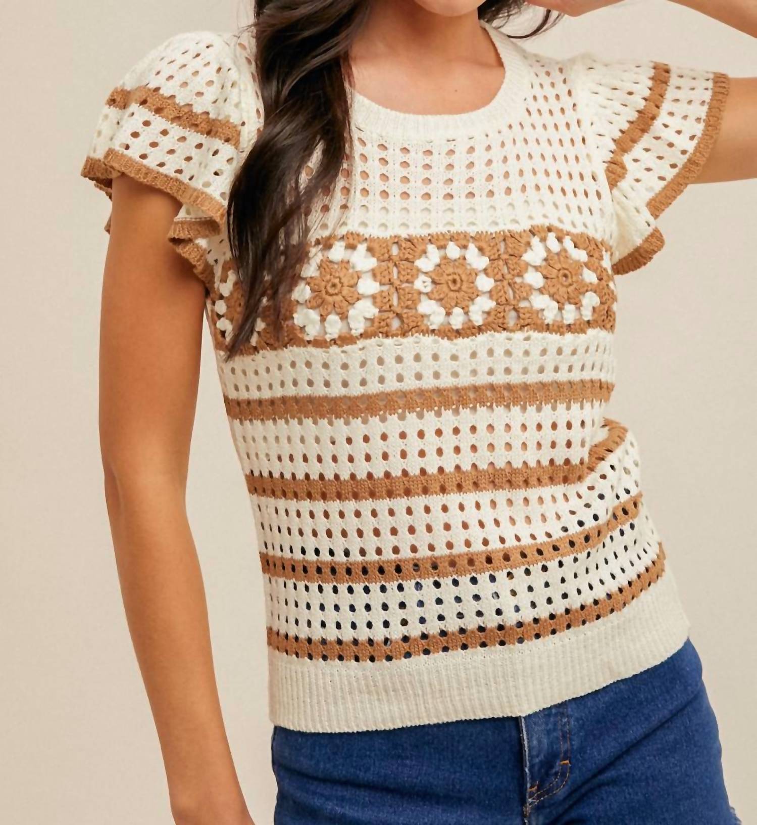 Experience the perfect blend of comfort and style with this trendy crew neck sweater, designed to effortlessly elevate your wardrobe. Pair it with your favorite denim and loafers for the perfect look. Boho chic essential in creams and tans perfect for fall. Features short flutter sleeves in a beautiful crochet open knit pattern. Composition: 100% Cotton. Pull on closure. Hand wash. Ideal for travel with its crewneck design. Hand wash.