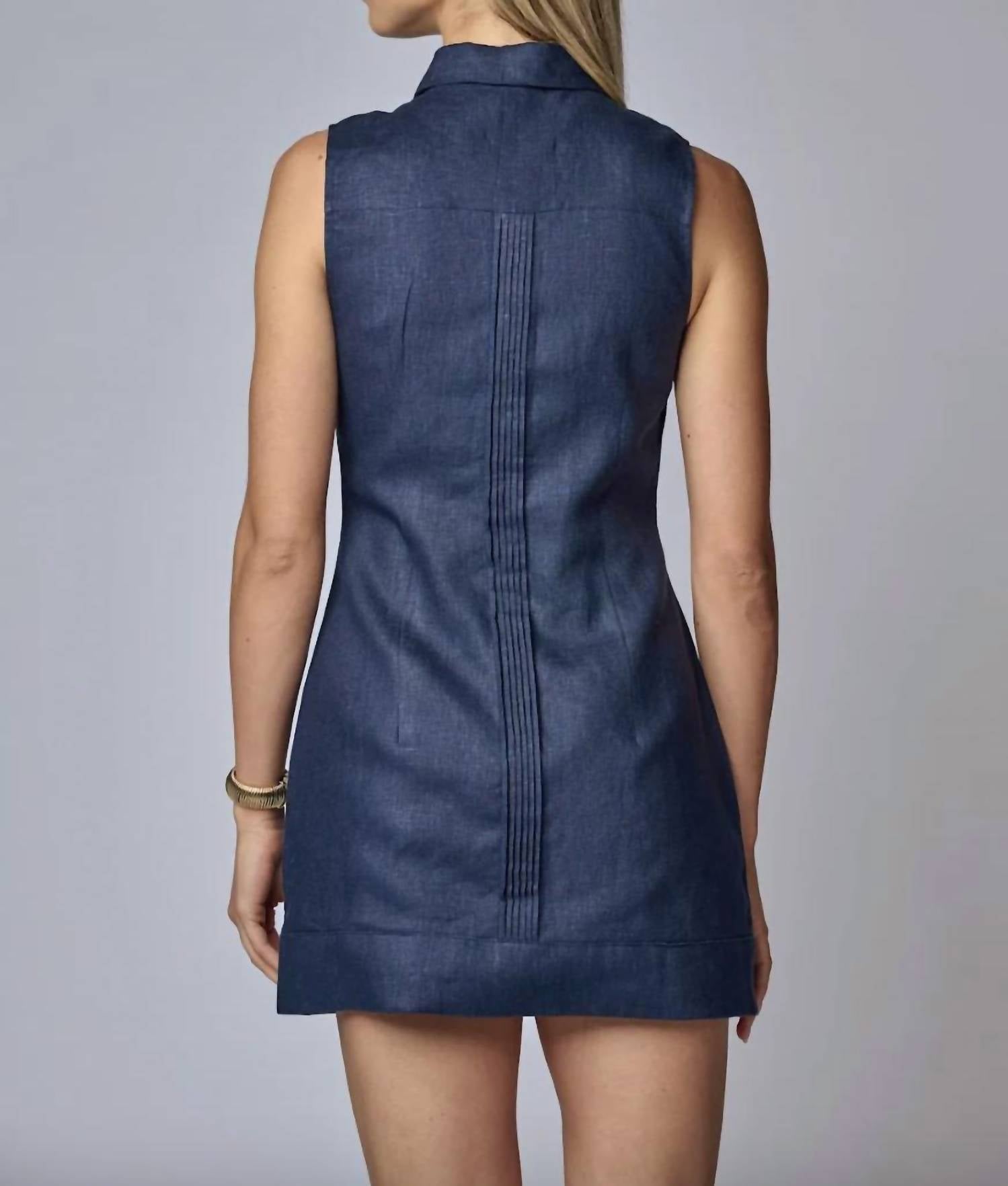 A short and breezy dress for those warmer days. Elevate your summer wardrobe with the Hevron Riva Mini Dress in Indigo, perfect for cocktail parties and workwear alike. This sleeveless shift dress is composed of our signature 100% linen, offering a breathable and luxurious feel. Its crisp fold collar and center front gold buttons highlight the elegant design, while hidden snaps ensure a smooth, seamless closure. For best results, machine wash and line dry this solid-patterned piece.