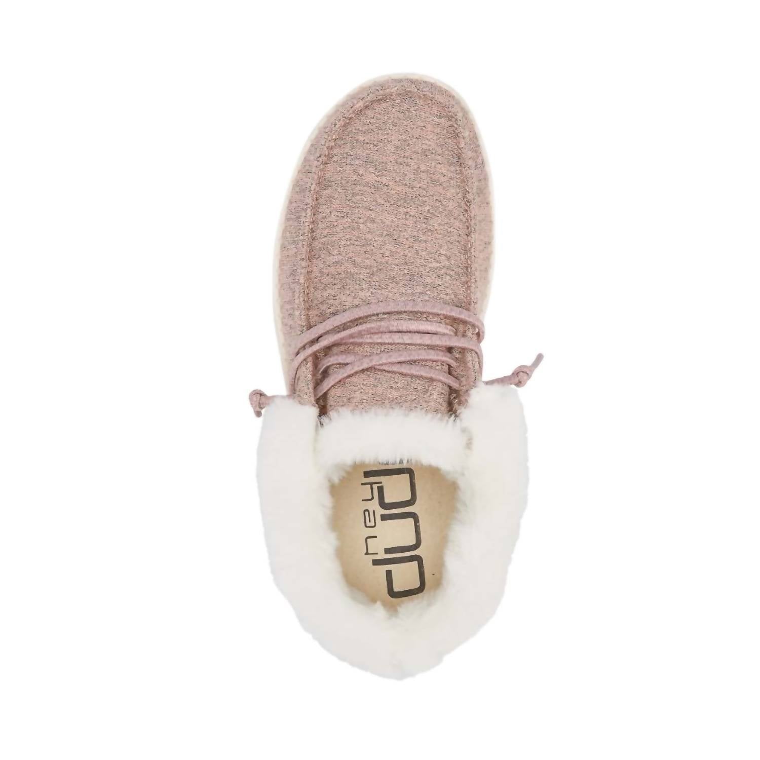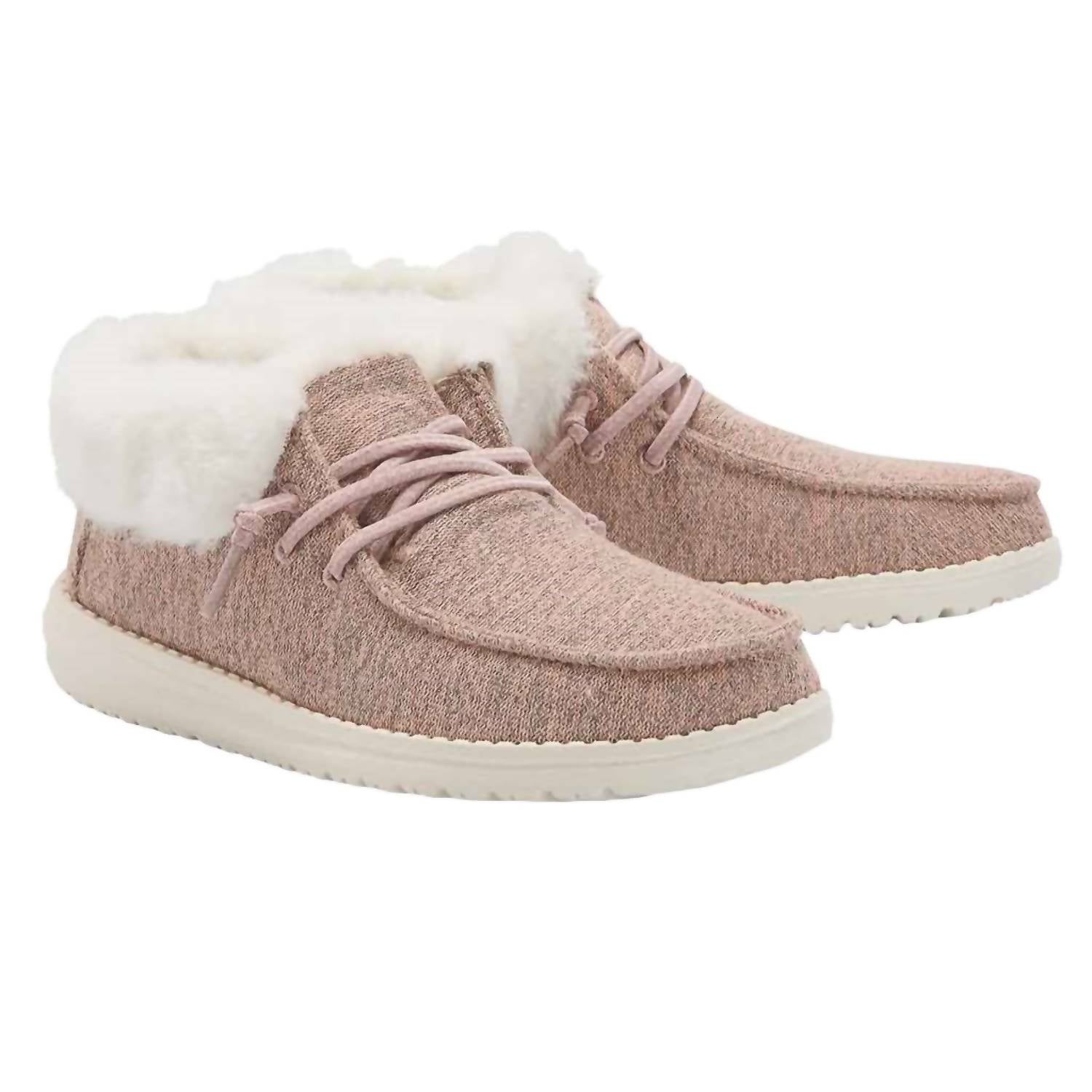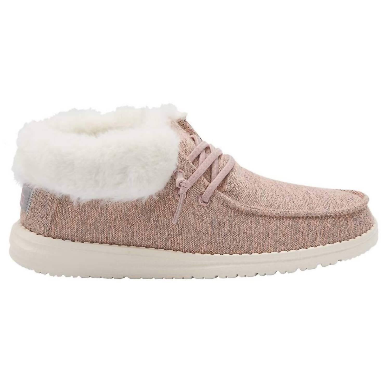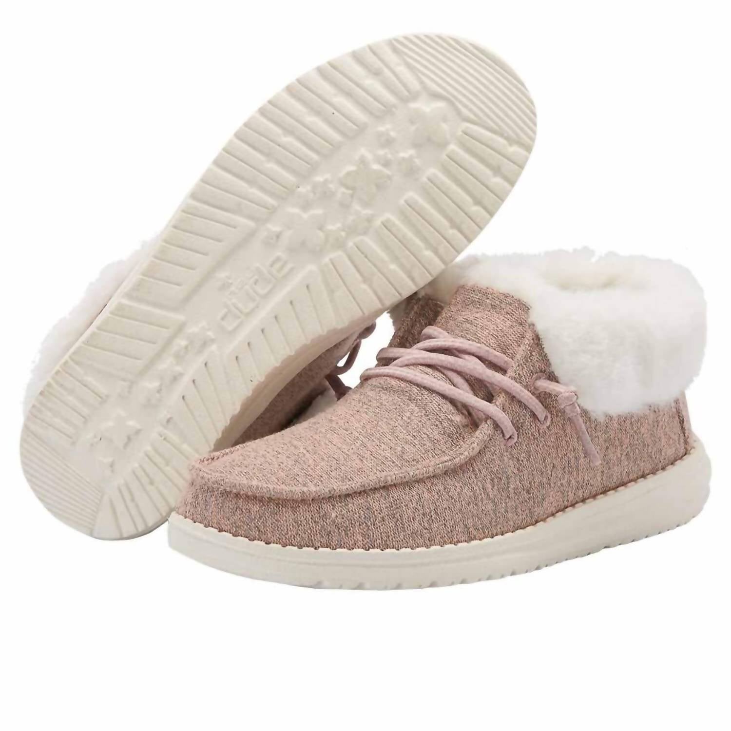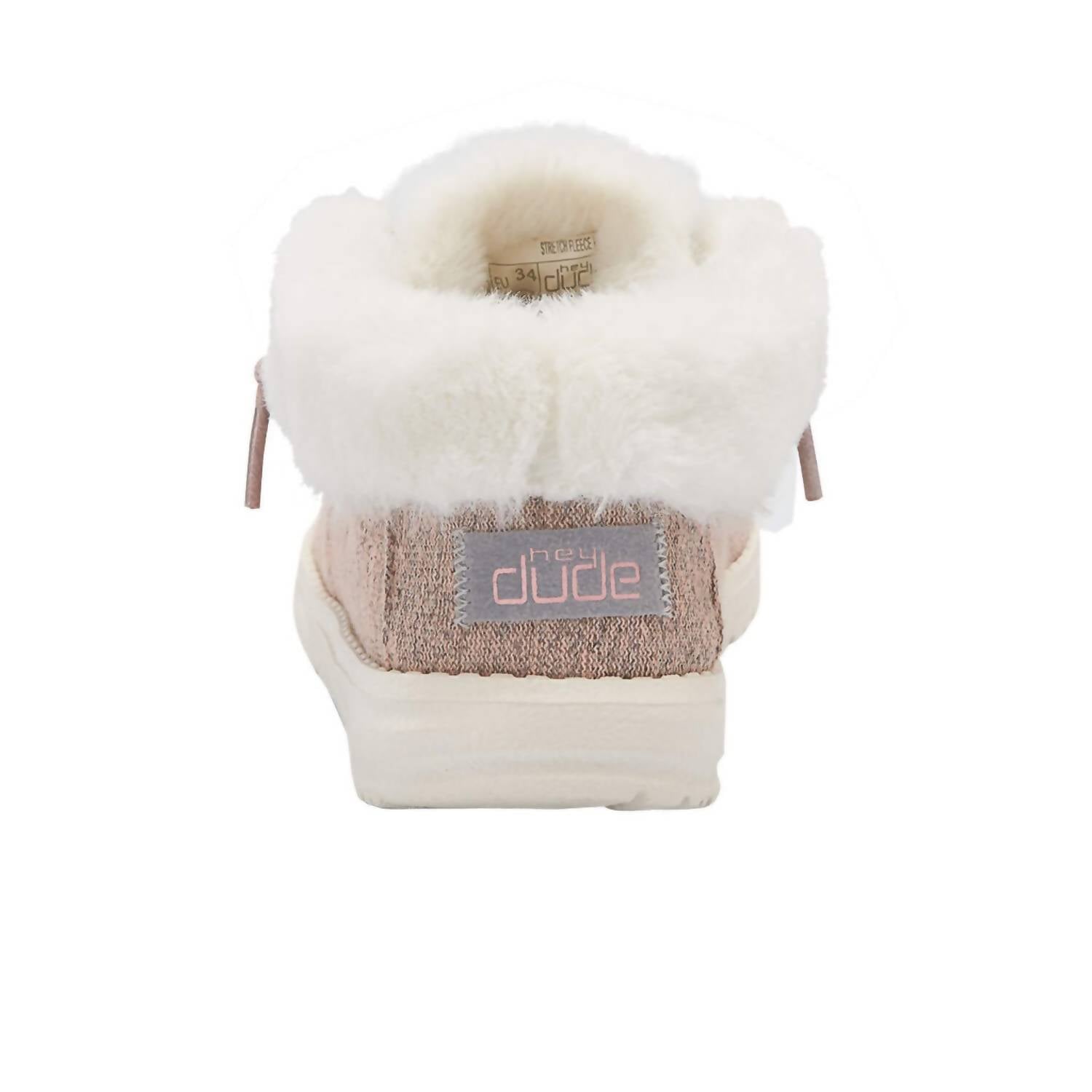 Introducing the Youth Britt Stretch Fleece Shoes by HEY DUDE, a stylish choice for travel. These pink sneakers feature an ankle bootie design with a canvas upper and faux fur inner lining that extends over the foldable cuff for warmth. A lace-up front provides a secure fit, while Flex & Fold Technology ensures ultra-light comfort. The shoes also include an ergonomic, leather-lined, removable memory-foam insole for added ease. Designed for teen girls with a round toe and flat heel, these shoes blend functionality with a classic winter boot look.