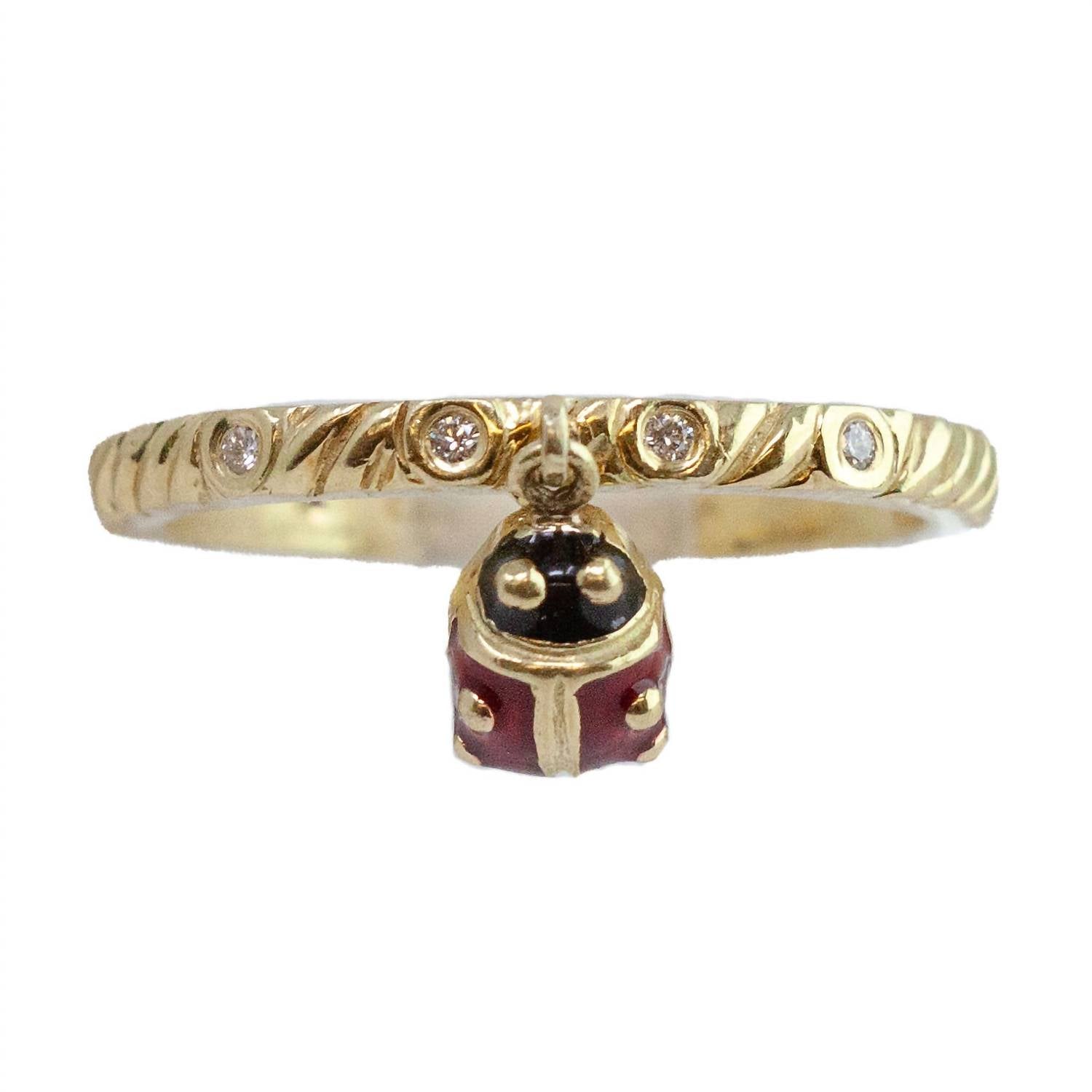 The wear-everywhere ring that you won't want to take off. The Women's Lady Bug Dangle Ring by Hidalgo is a charming addition to any jewelry collection, featuring 18k yellow gold and adorned with a delicate white diamond of .03ct. Ideal for fashion-forward individuals, this gold piece adds a playful yet luxurious touch to your ensemble. Enjoy its sophisticated elegance as it brings a sparkle to your everyday style. Crafted with attention to detail, this ring is a must-have for those who appreciate unique and high-quality jewelry.