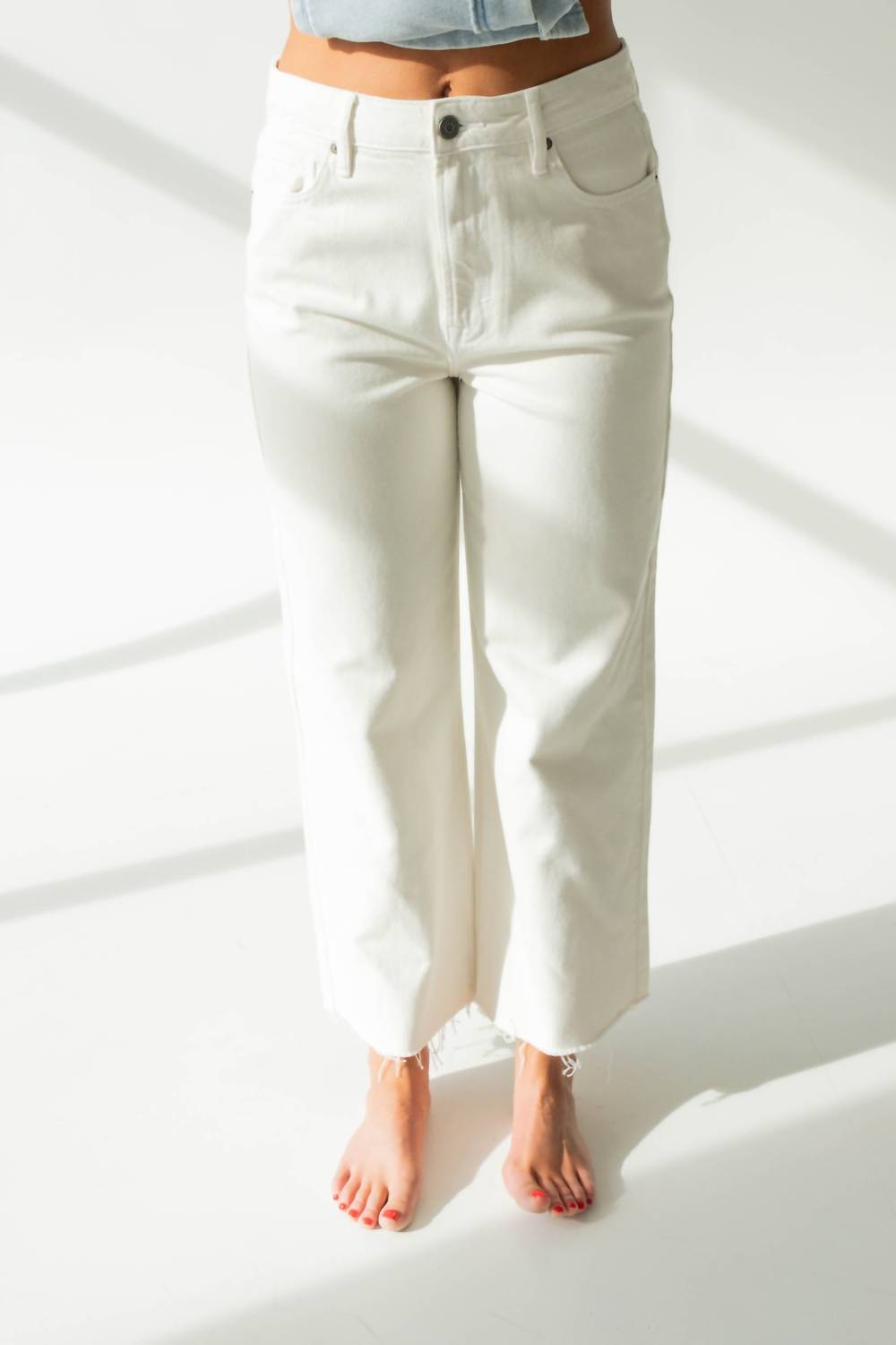 Discover the Nori High Rise Crop Wide Leg Jean by HIDDEN, a perfect spring staple in Sea Salt, designed for versatile wear. Featuring a high rise and wide leg style, these jeans offer a trendy cropped length and come with a solid pattern that pairs well for any occasion. They have practical pockets and a secure button closure, making them ideal for a minimalist vacation look. The model, standing at 5’6” with measurements 35.5” chest, 27” waist, and 36.5” hip, is wearing a size 27.
