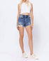 Meet the Sofie With Raw Hem Mom Short by HIDDEN, a perfect addition to your summer streetwear collection. These dark blue jean shorts, crafted from a comfortable cotton blend, boast a trendy distressed look with a raw hem. Composition: 93% Cotton, 5% Polyester, and 2% Spandex. Closure: Button closure. Care: Machine wash. Ideal for vacation outings, this solid pattern design also features practical pockets for added convenience.