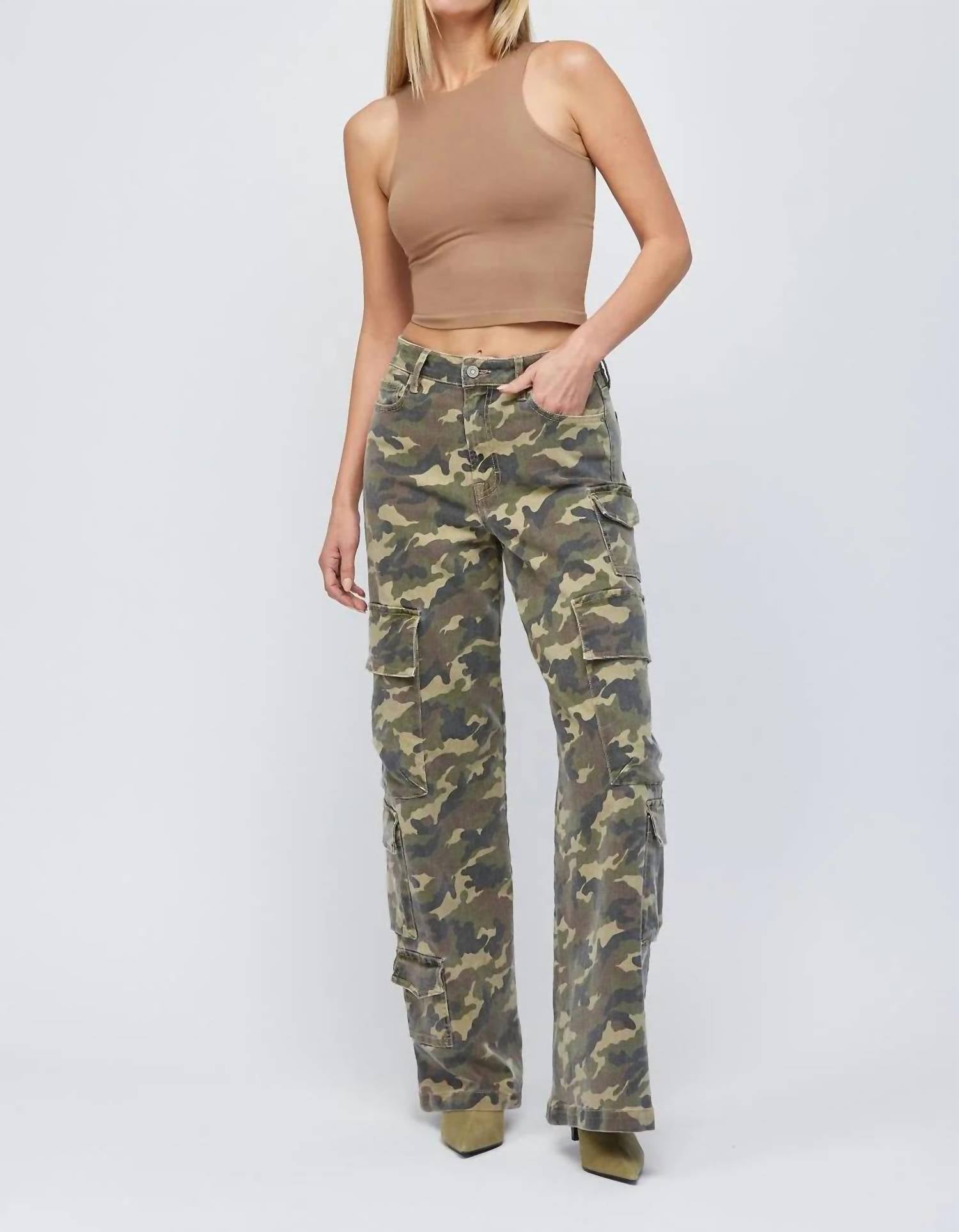 A flattering silhouette that's suprisingly versatile. Introducing the Wide Leg Camo Jean by HIDDEN, a striking addition to your wardrobe in a vintage-inspired camouflage print. These high-rise jeans offer a relaxed fit with a wide-leg style and feature practical pockets. Crafted from a cotton blend, they include a zip closure for easy wear. Measurements are based on a size Small: Rise - 11.5 inches, Inseam - 32 inches. Care: Machine wash. Fabric: 94% Cotton, 5% Polyester,1% Spandex.