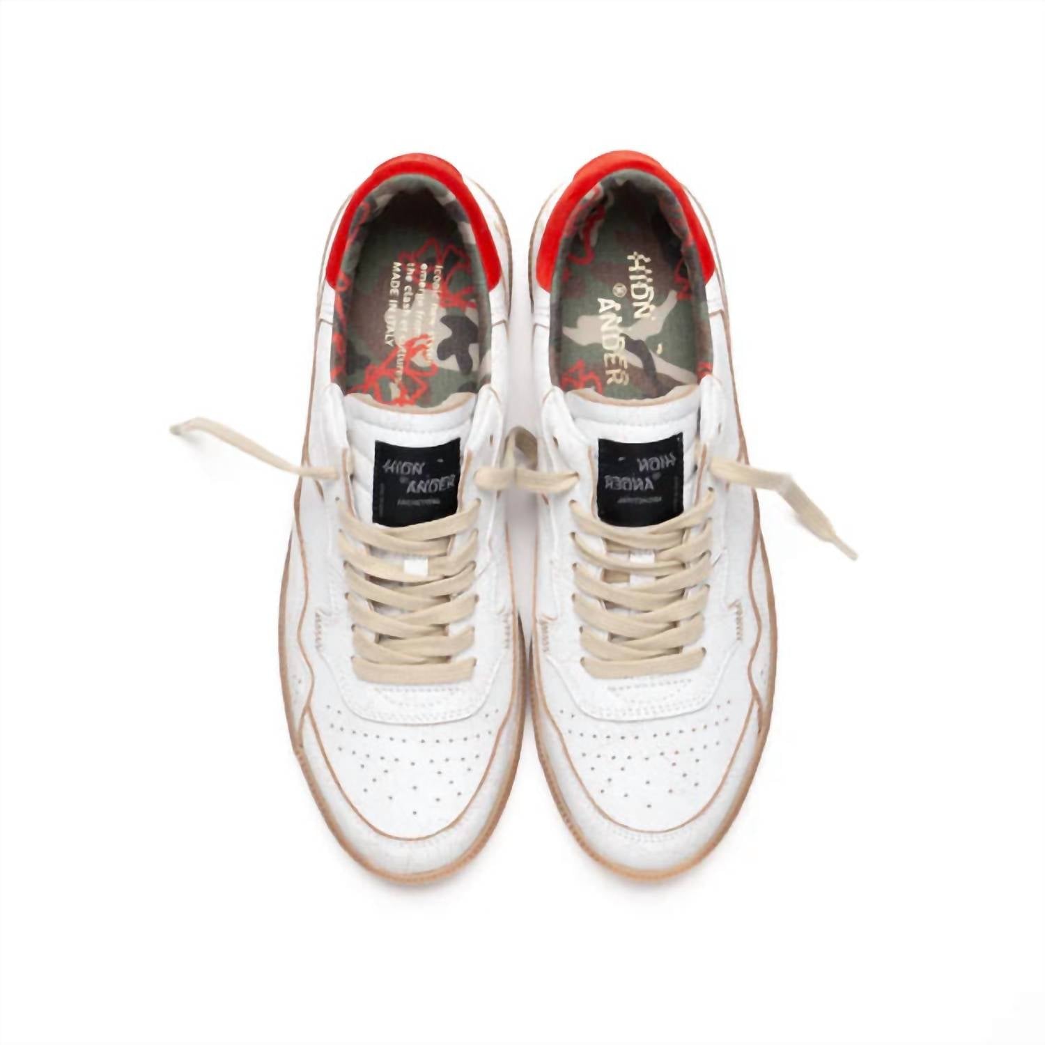 Introducing the Women's Mega T Sneaker by Hidnander, an Italian-crafted shoe inspired by the elegance of tennis. This legend-worthy sneaker features an upper made from a luxurious blend of suede and leather in a sleek white and red design. The retro rubber outsole boasts a low profile, perfect for those who appreciate minimalist style with a touch of boldness. Ideal for game day, these sneakers embody Hidn-ander's sustainable design approach.