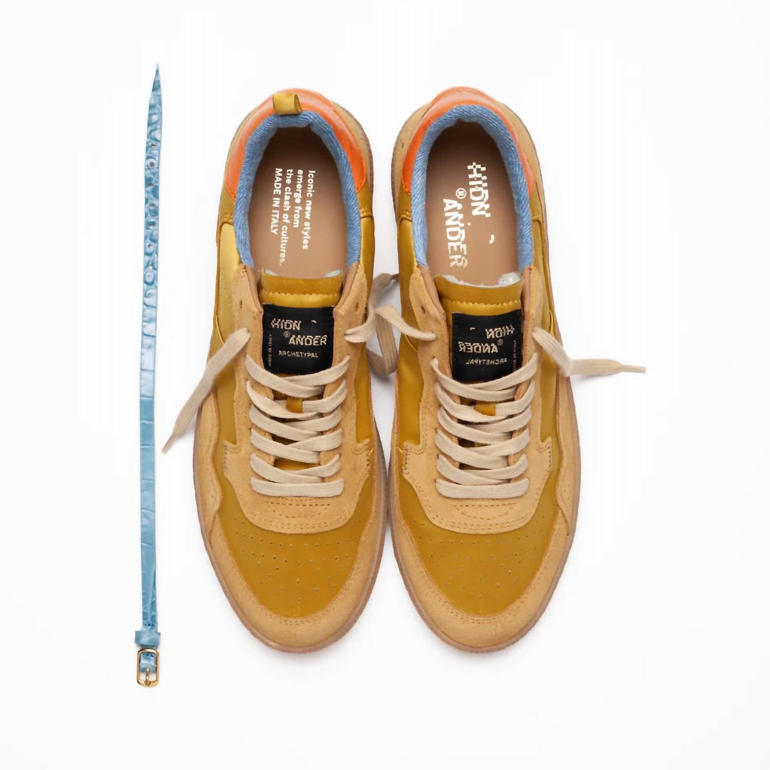 Get your daily steps in with these adorable sneakers. Meet the Women's Mega T Sneakers by Hidnander, an Italian-made masterpiece merging tennis inspiration and bold fashion statements. These women's athleisure sneakers showcase a trendy yellow hue with a suede and leather upper complemented by a retro rubber low-profile outsole. Designed with an effortlessly chic round toe and flat heel, they are perfect for summer game days. Made entirely in Italy, they embody a sustainable approach to modern style.