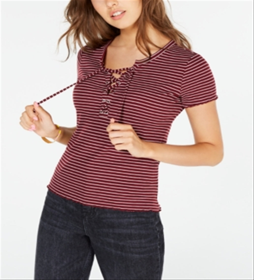 Hippie Rose Junior's Lace up Rib Knit Top Zinfandel Stripe Red Size Medium