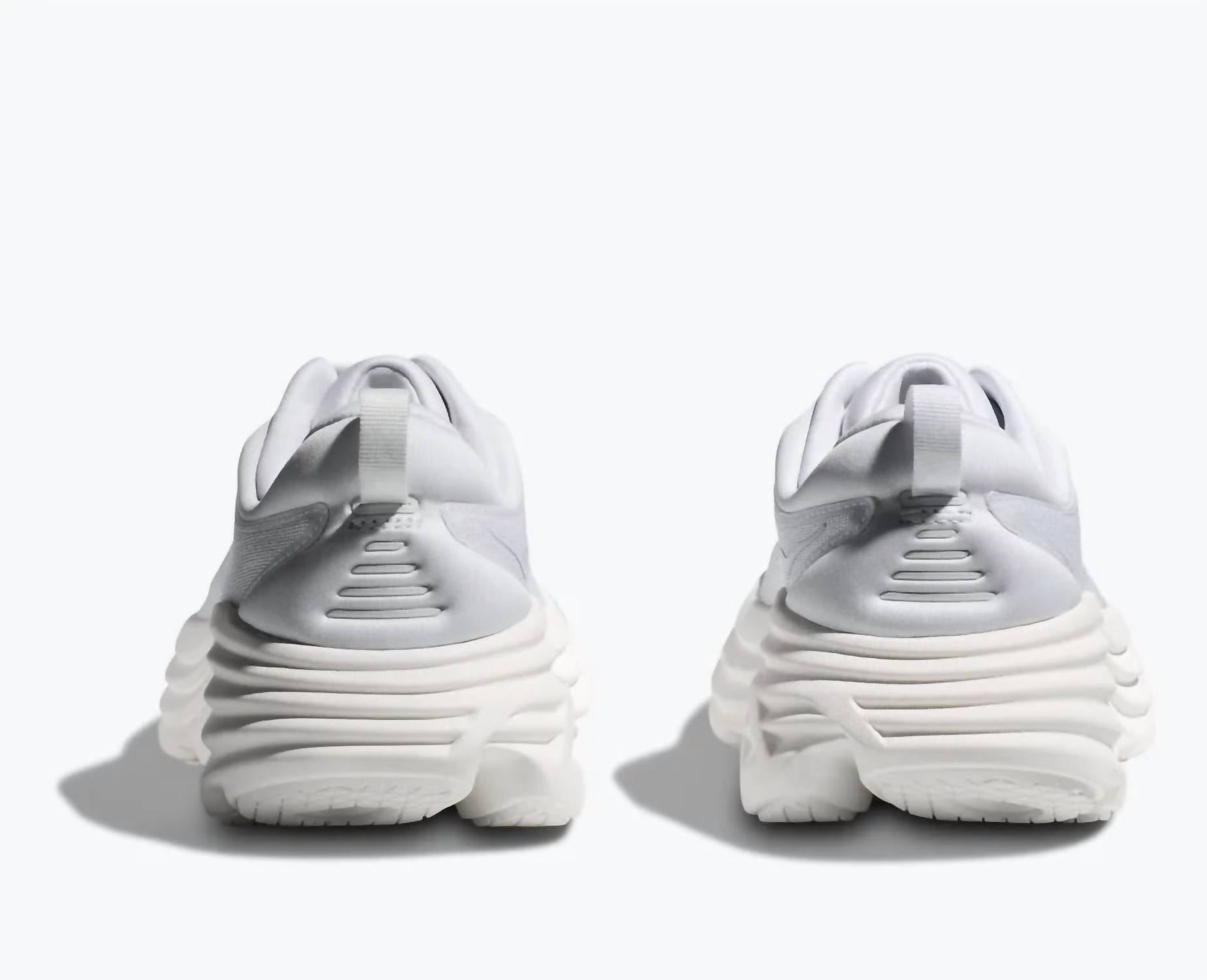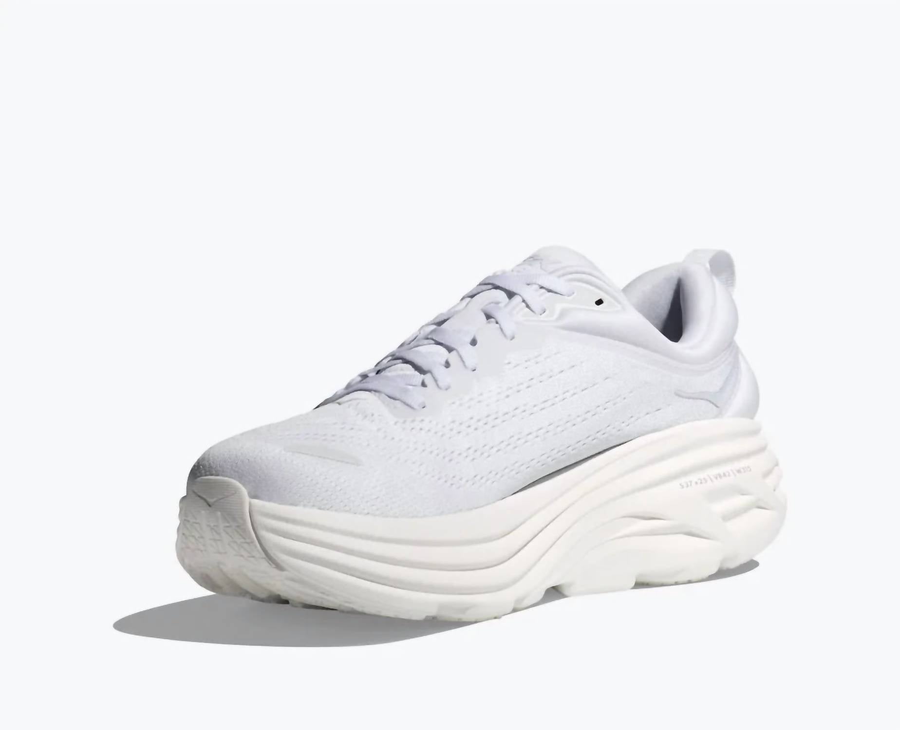 Step up your running game with the Hoka Men's Bondi 8 Shoe in white, designed for both everyday runs and walking comfort. These sneakers feature an engineered mesh construction and a partially gusseted tongue, providing a secure fit with added breathability. The Ortholite® hybrid sockliner ensures superior comfort, while the lightweight, resilient foam offers a cushioned ride. Zonal rubber placement reduces weight, and the Durabrasion rubber outsole guarantees durability, making them perfect for summer outings or game day.
