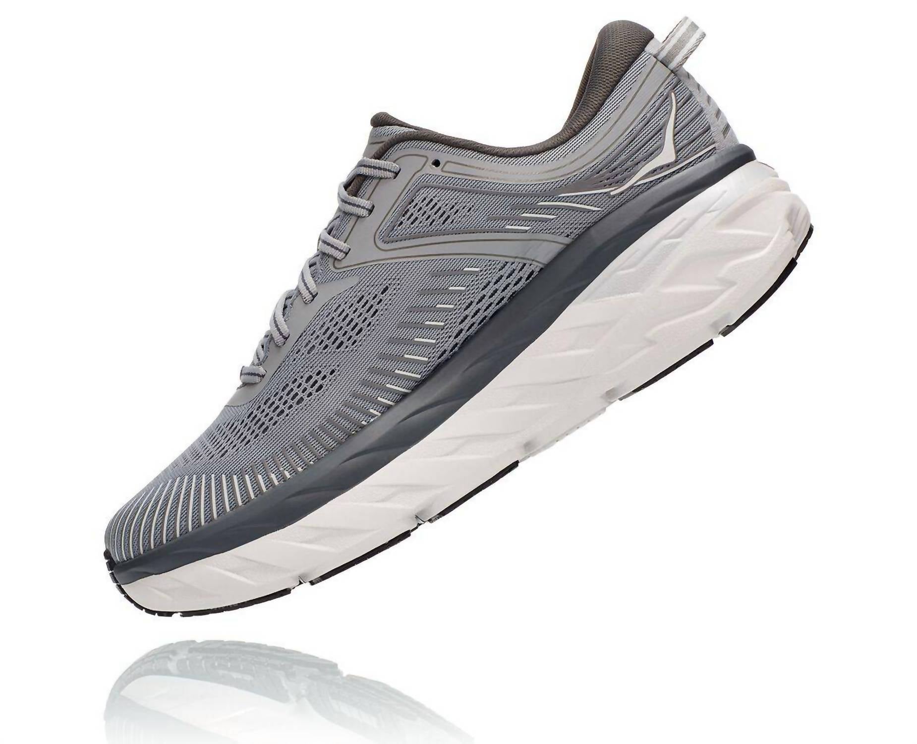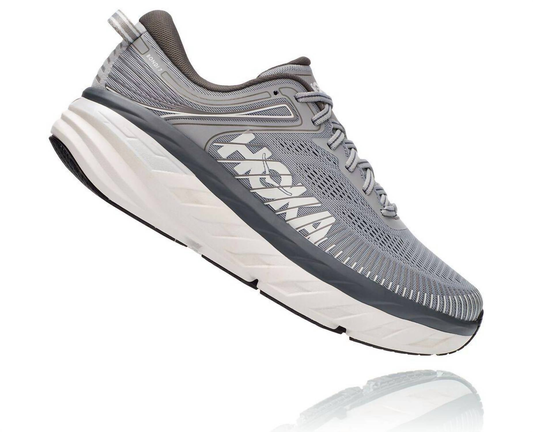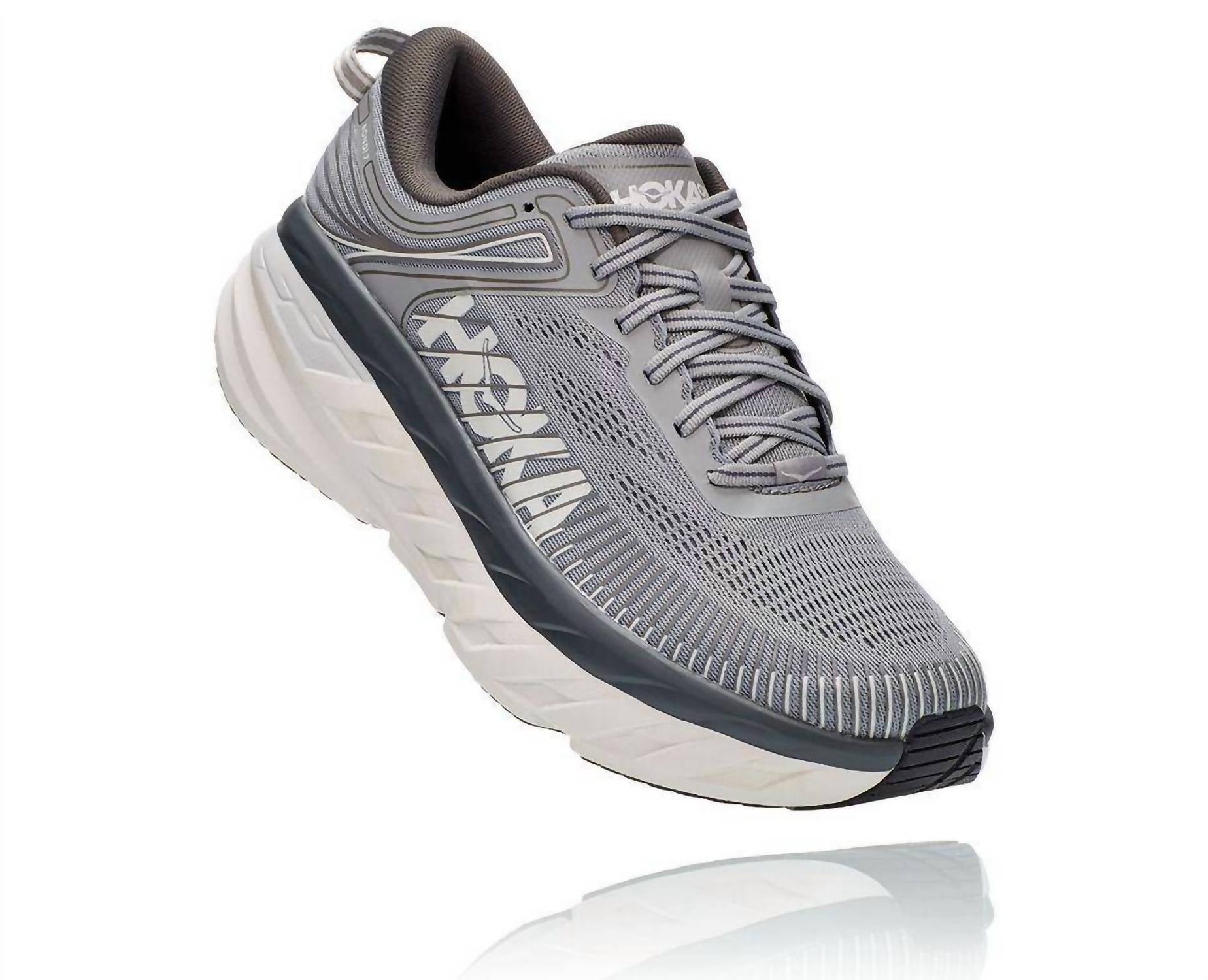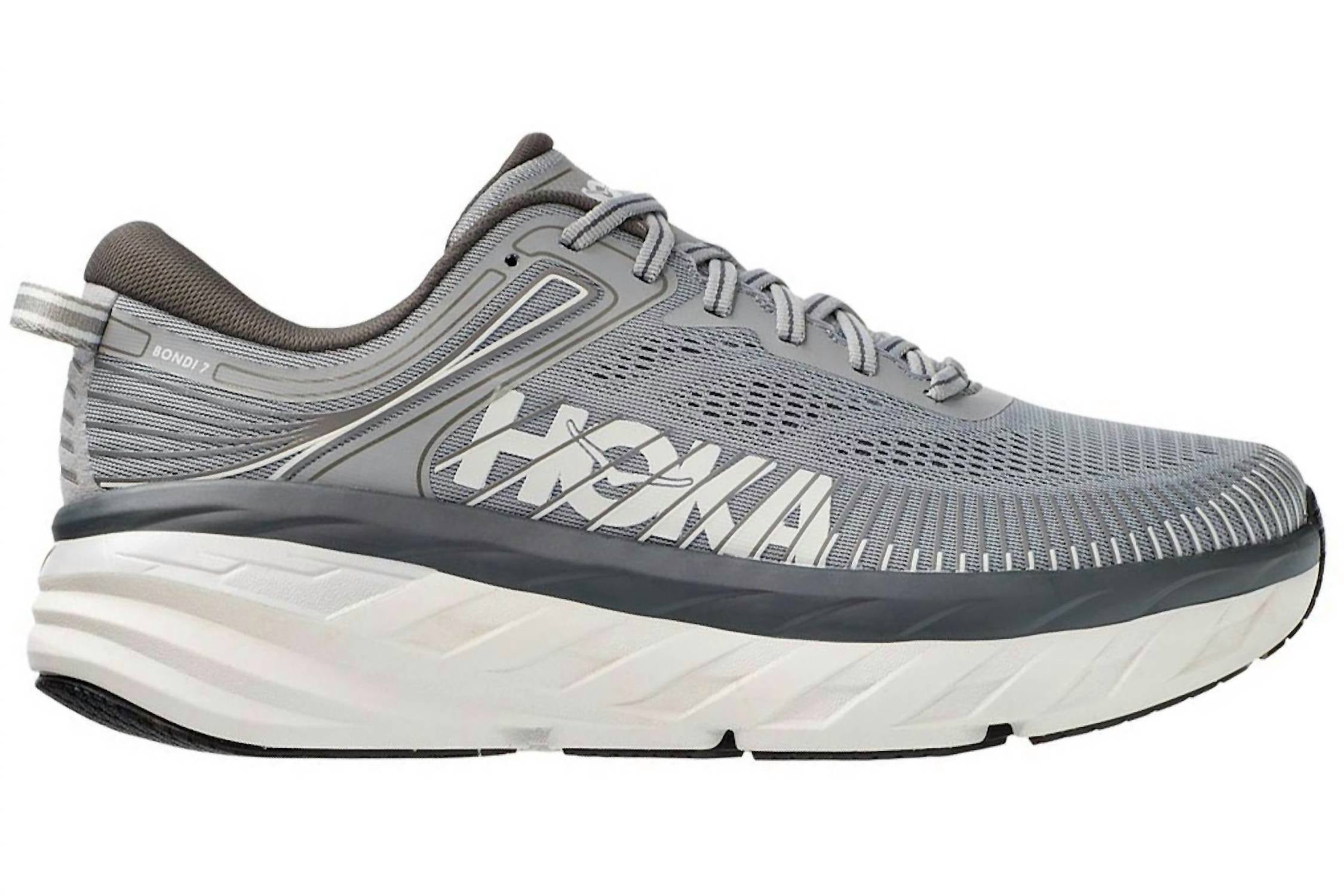 Step into ultimate comfort with the Men's Bondi 7 Wild Dove Dark Shadow Shoe by Hoka, the most cushioned option in their road-shoe lineup. Designed to deliver a smooth, balanced ride, these sneakers feature an open-engineered mesh for breathable comfort, a memory foam collar for ankle cushioning, and TPU overlays for added midfoot support. The shoe is crafted with a full-length compression-molded EVA midsole and a sleek rubber outsole that reduces weight while boosting durability. Ideal for game day, these grey sneakers sport a round toe and flat heel, offering a blend of style and superior cushioning for all your summer activities.