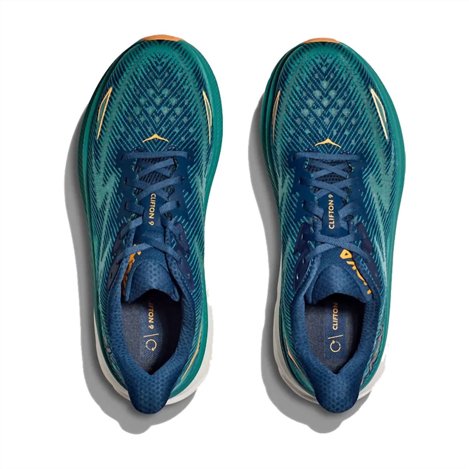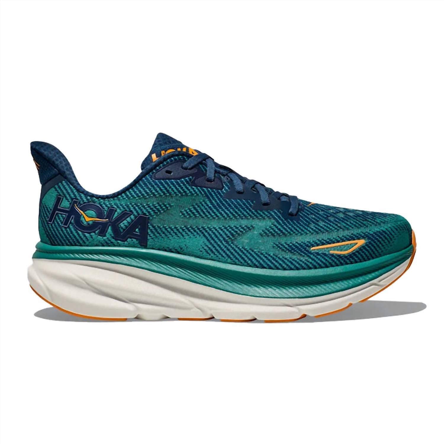 Discover the Men's Clifton 9 Running Shoes by Hoka in a striking Midnight/Oceanic hue, offering a softer feel and lighter weight for a superior running experience. This sneaker models the latest evolution in the award-winning Clifton series, featuring vegan-friendly materials and a 3mm increased stack height for an elevated platform. Benefit from its sustainable design, incorporating recycled content such as polyester laces. Ideal for adult men, these sneakers sport a comfortable round toe shape, allowing you to conquer challenging miles effortlessly.