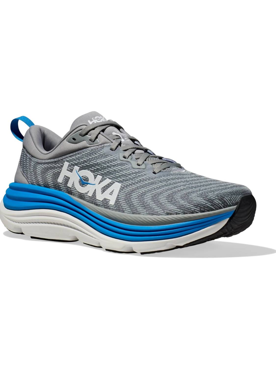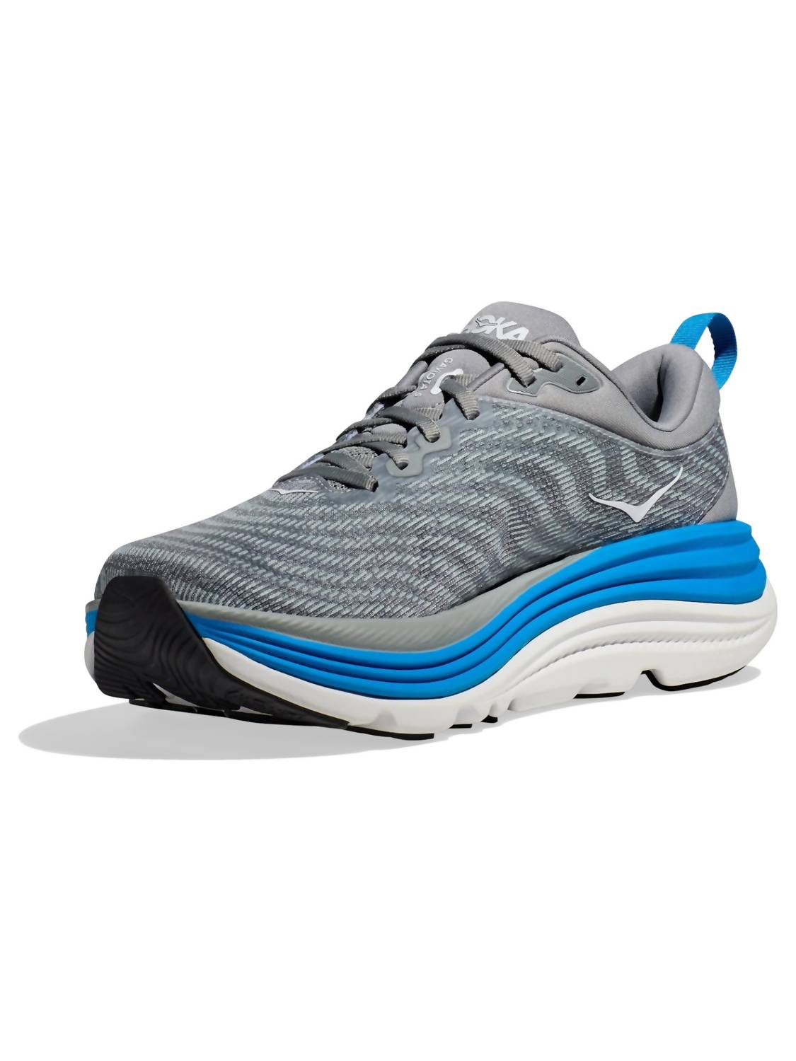 Introducing the HOKA Men's Gaviota V5 Sneakers - Medium, designed for unmatched stability and comfort in athletic pursuits. Sporting a plush tongue and collar, the shoe is crafted with Creel jacquard mesh upper and features H-Frame™ technology for enhanced stability. Its soft EVA foam and Early stage MetaRocker™ provide cushioning and a smooth ride. Ideal for everyday running and walking, this men's shoe boasts a refined, wider fit and comes in a sleek grey hue. The round toe shape ensures an accommodating fit for all-day wear.