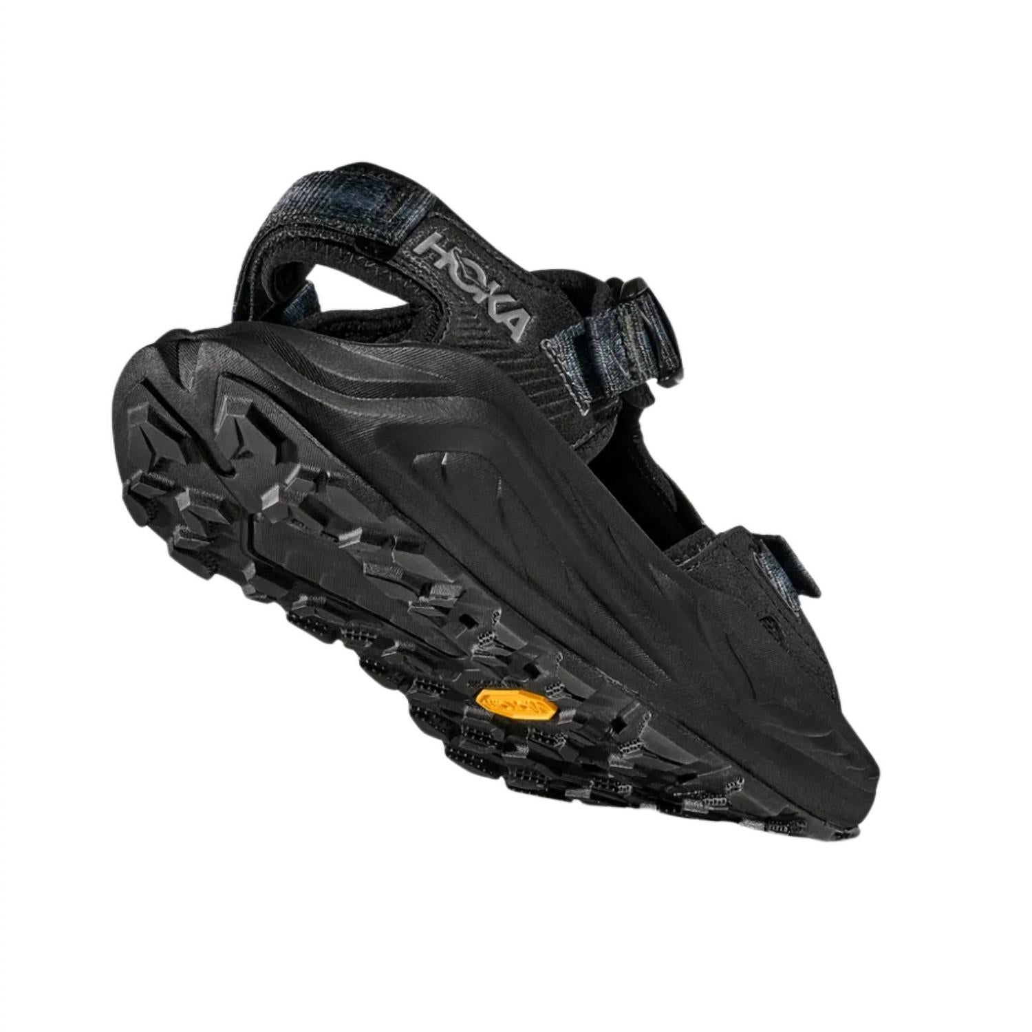 Experience ultimate outdoor comfort with the Men's Infini Hike Adventure Sandal by Hoka, now available in sleek black. This open-toe sandal boasts a spongy Ariaprene® upper with quick-dry performance and three adjustable points for a customized fit. Its dual-density midsole integrates a molded sugarcane CMEVA topsole, while a Vibram® Megagrip outsole with 3.5mm lugs ensures exceptional grip. Designed for streetwear and summer hiking, the sandal features Life Natural® anti-odor technology and is adaptable for resoling.