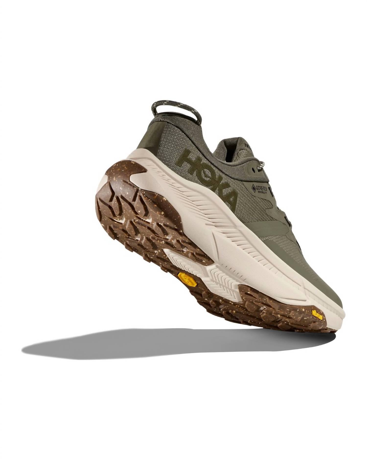 Introducing the Men's Transport GTX Waterproof Athletic Shoes by Hoka, designed in a minimalist slate color for the modern, eco-conscious commuter. This versatile shoe blends lifestyle and performance with a Cordura® main mesh and a GORE-TEX Invisible Fit, both incorporating recycled polyester. The innovative design includes a 35% sugarcane EVA midsole and a Vibram® EcoStep Recycle EVO outsole with 30% recycled rubber, ensuring sustainability at every step. Featuring a quick-toggle lace system and 360-degrees of reflectivity, these shoes are perfect for everyday adventures, walking, hiking and can handle urban environments with ease.