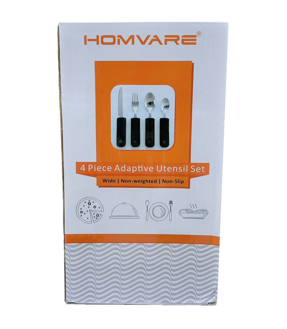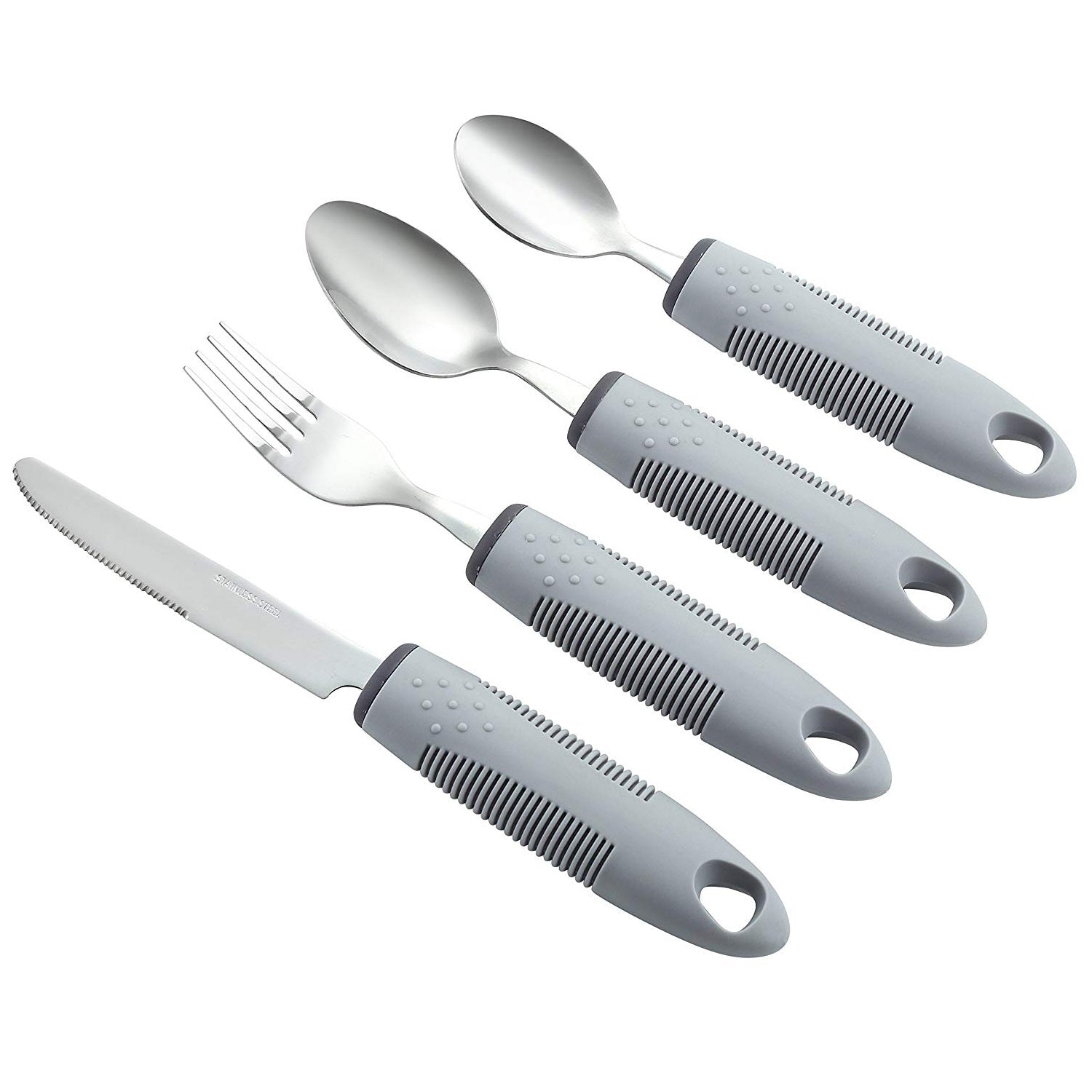 Large handles are designed for easy grip; Suited for people with arthritis and other conditions that impair movement and manual dexterity. | Features ribbed rubber handle and premium steel tips that are designed for non-slip holding. | Made with premium steel to ensure durability and longevity; Dishwasher safe for easy and quick cleaning. | Non-weighted adaptive utensils; Wider ribbed handle with raised, textured grips to improve dexterity and control. | Includes fork, knife, dinner spoon and soup spoon.