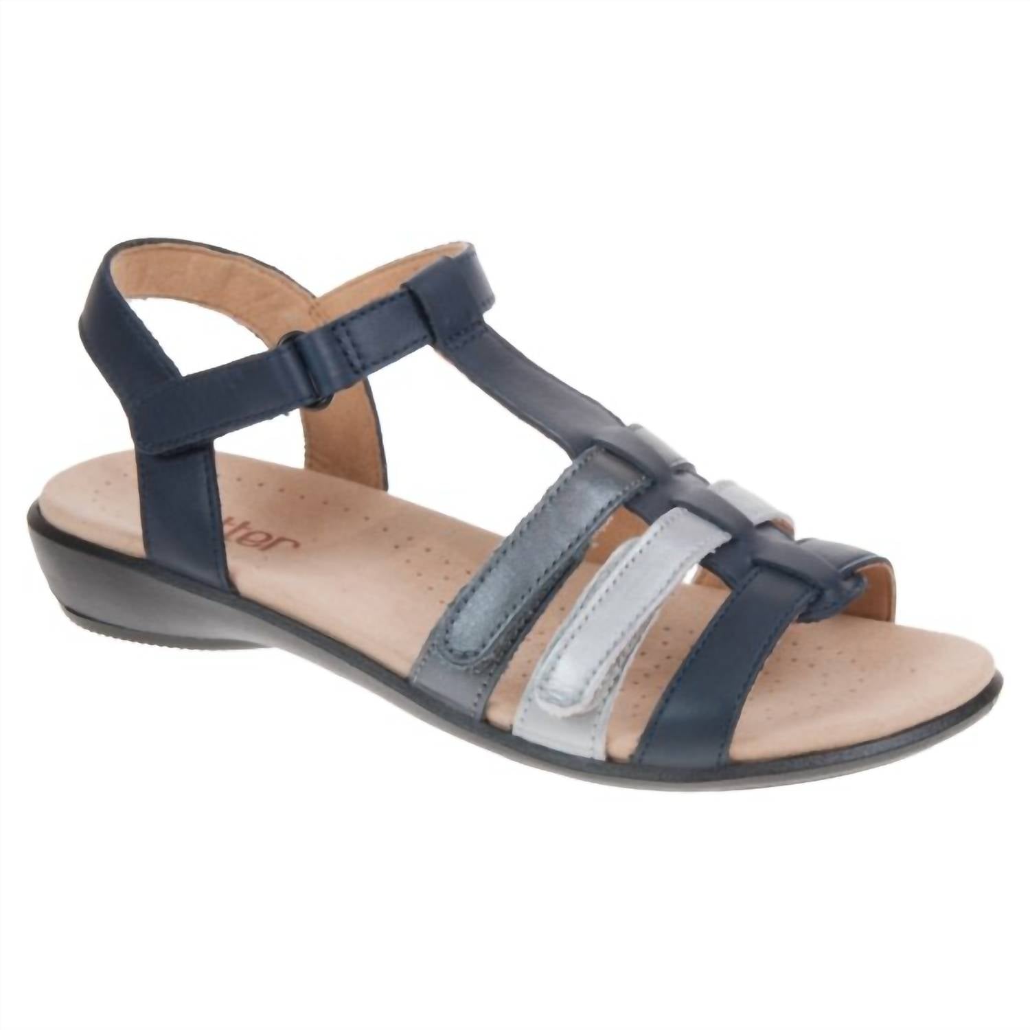 Classicly cute and all-day-wearable. We love this sandal. Step into effortless style with the Women's Sol Sandals by Hotter, beautifully crafted in a Navy Multi hue. These gladiator-style sandals feature three adjustable touch-close straps, offering superior ankle support and a cushioned, contoured footbed for maximum comfort. Constructed with a leather upper, all-textile sock and lining, and an all-polyurethane sole, they promise durable wear and a chic open-toe design. Enjoy a low heel height of 30mm (1 1/4 inches) to complement your every step with ease.
