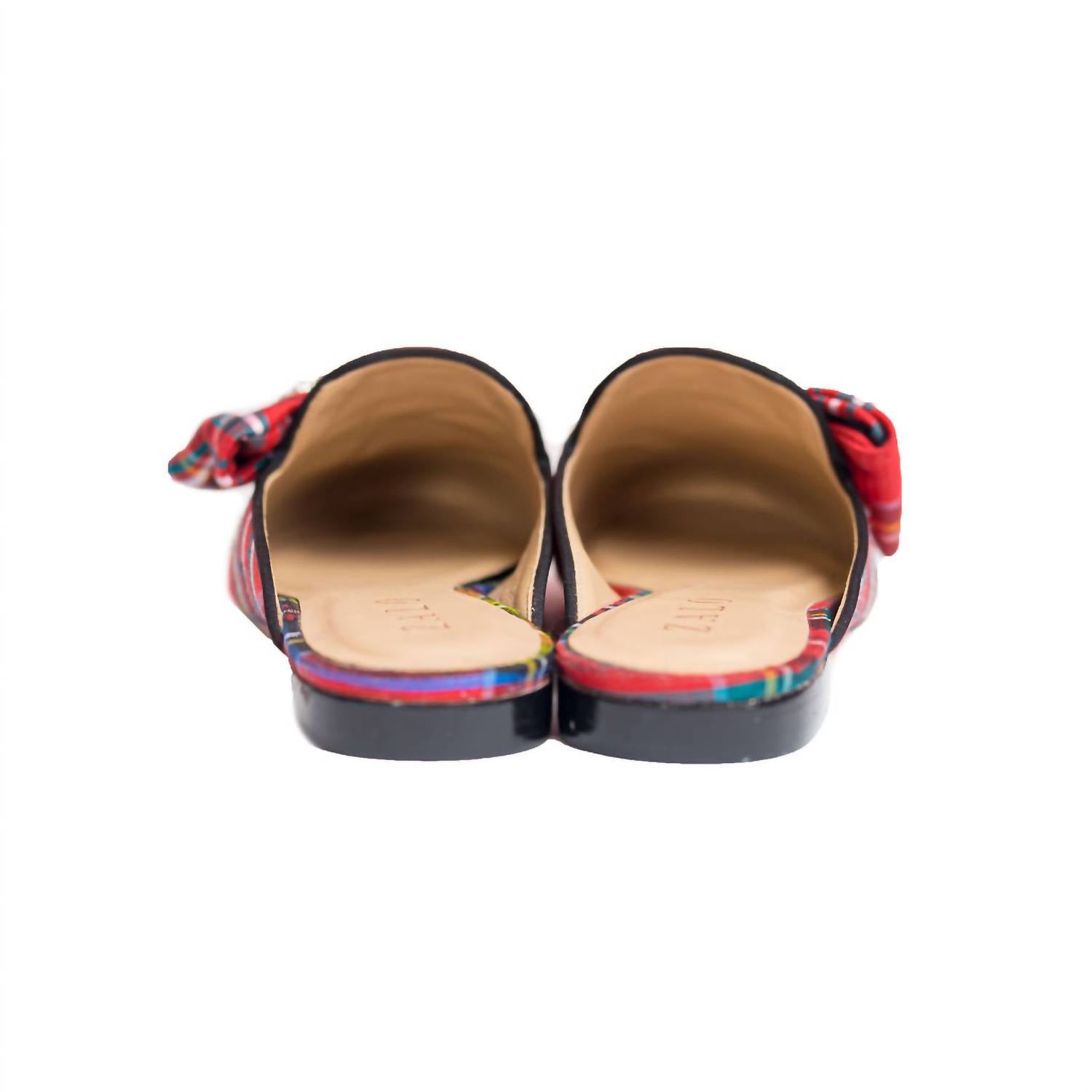 Our Cheers mule features a Crystal Wreath Brooch on a Tartan Shantung upper with black grosgrain trim. Napa Leather Lining for additional support and comfort. 0.75 inch Leather Stack Heel. Leather Sole.