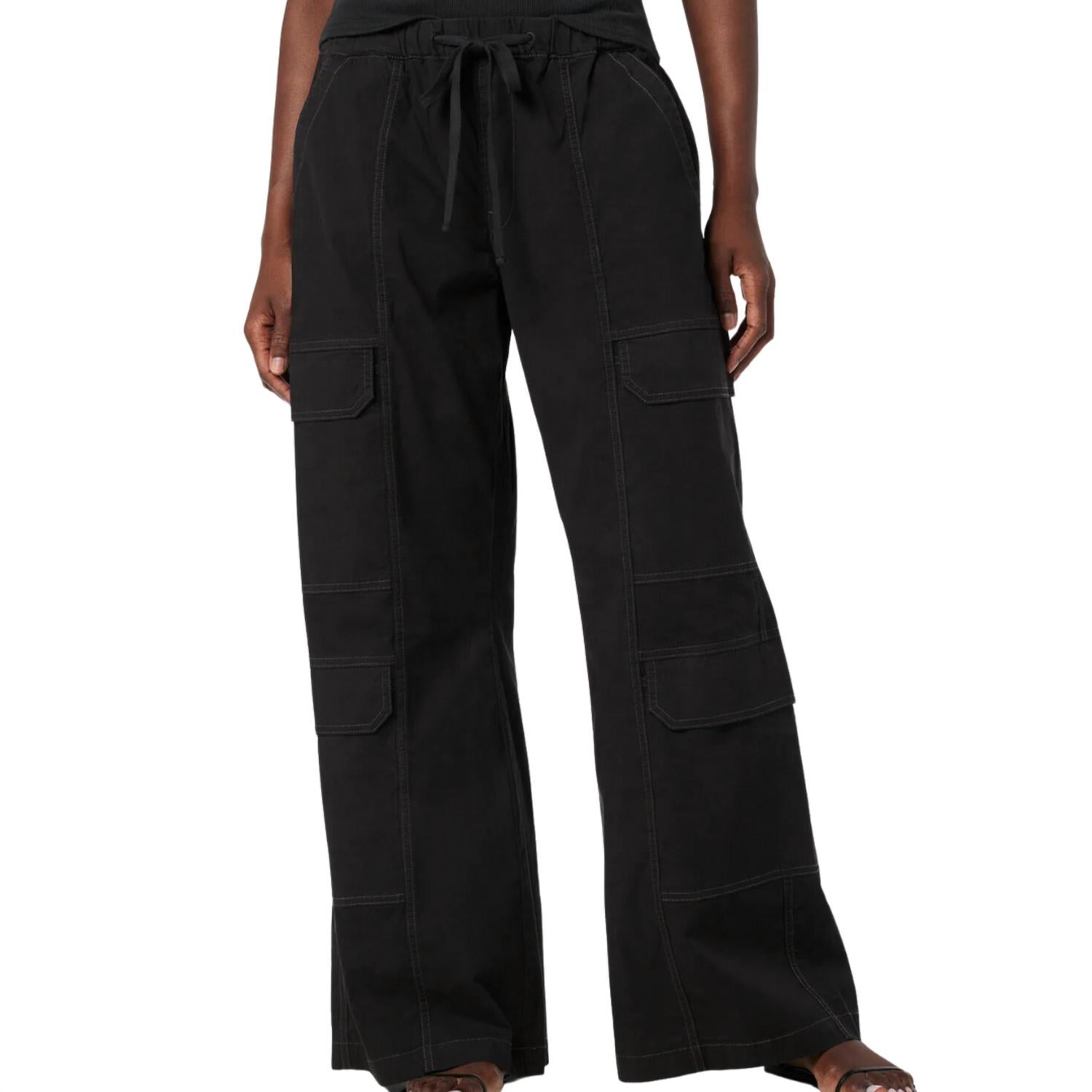 Hudson Drawstring Parachute Wide Leg Cargo Pant Cotton, Elastane in Black Wide Leg Pants Adjustable Drawstring Waistband Over-Dyed White Lightweight Stretch Cargo Pockets Subtle Contrast Stitching Front Rise 11" Leg Opening 25" Inseam 32" True to Size