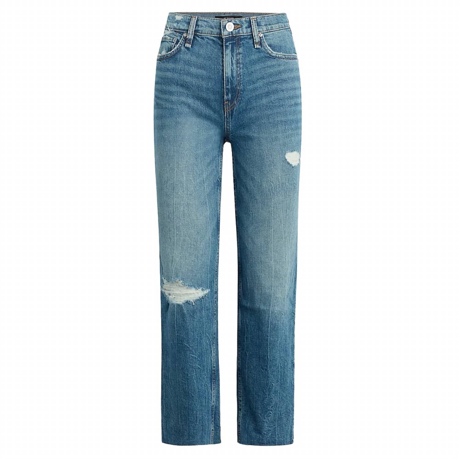 Tuck your favorite tee into these high-waist jeans for a more casual-cool feel. Discover the Remi High Rise Distressed Cropped Straight Leg Jeans by Hudson in the captivating color, Stunner. Expertly crafted from 98% cotton and 2% elastane, these jeans feature distressing on the front legs, a 26" inseam, and an 11.25" rise, ensuring a relaxed fit with a vintage trend in mind. The straight-leg design is complemented by a convenient zip closure, making them an ideal choice for transitional weather paired with heels. Care for these jeans is simple with machine wash instructions. Model is 5'10" and is wearing a US size 4.