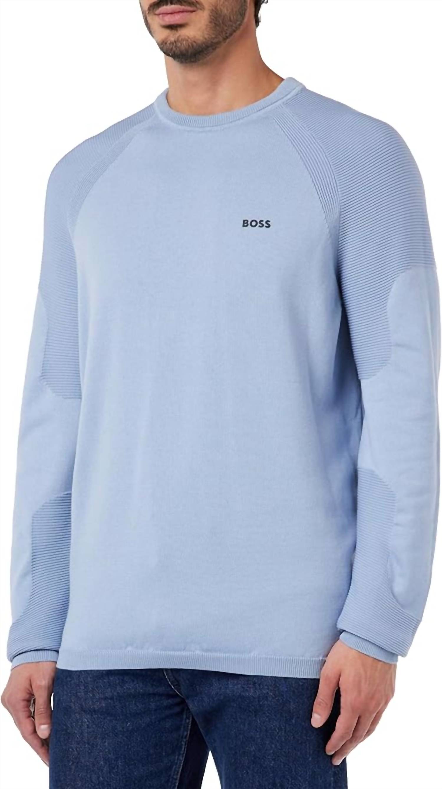 Introducing the Hugo Boss Perform-x Sweater in sophisticated blue, perfect for both your streetwear looks and vacation style. This crewneck sweater for men features long sleeves with a textured knit design and proudly displays the Boss logo in white. Made from 100% cotton, it is imported and offers a comfortable, regular fit. Care: Machine wash.