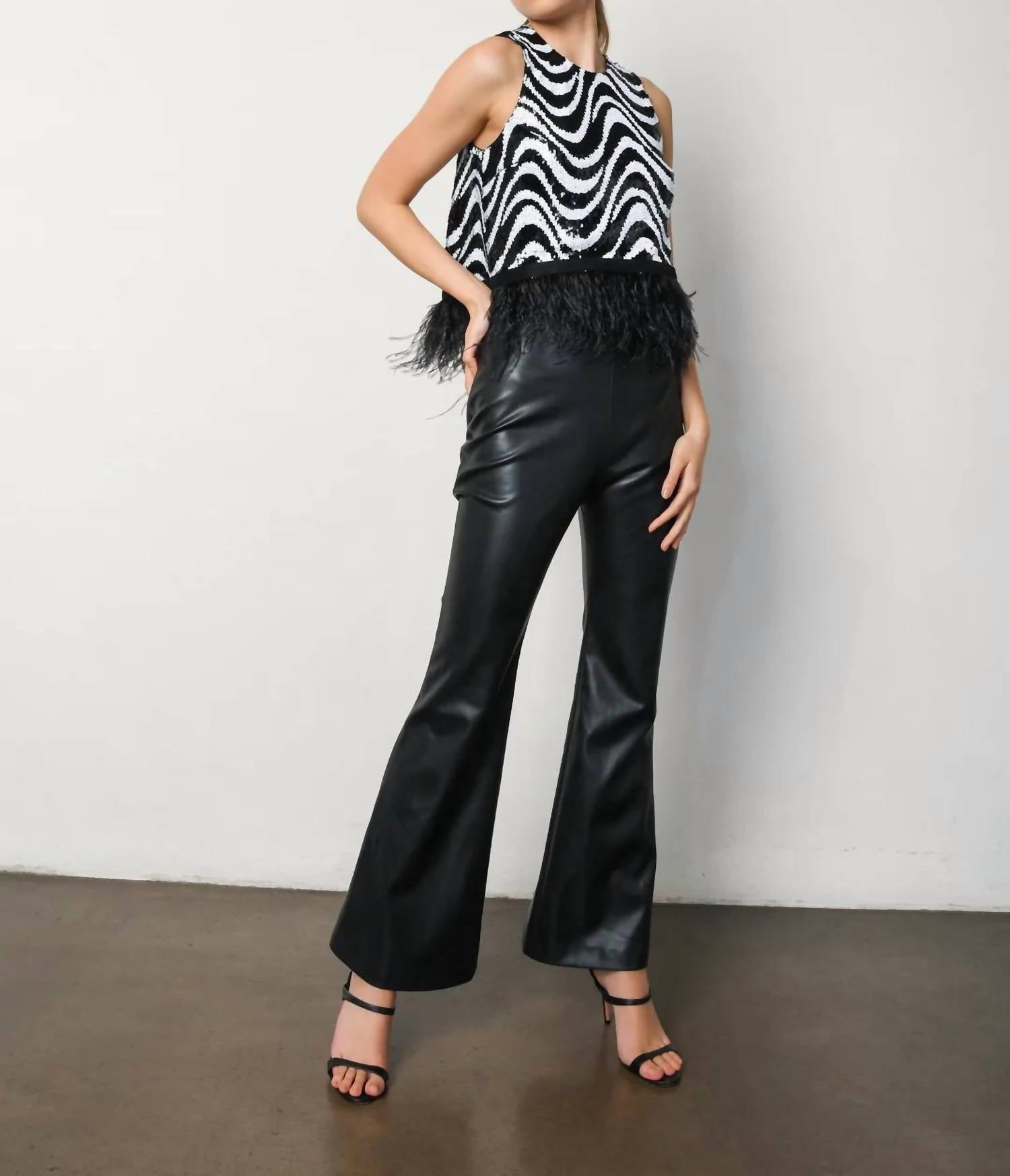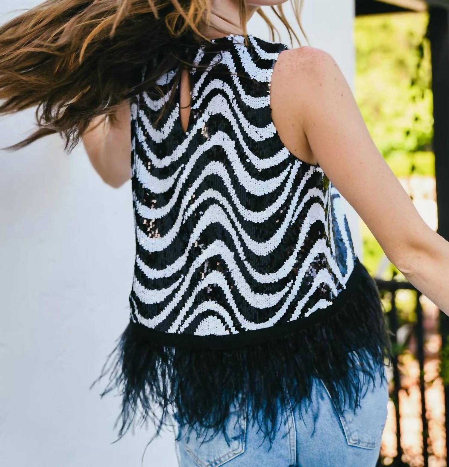 Sleeveless high low hem top with feather trim. Black and white wave sequin. 16.5" from HPS.