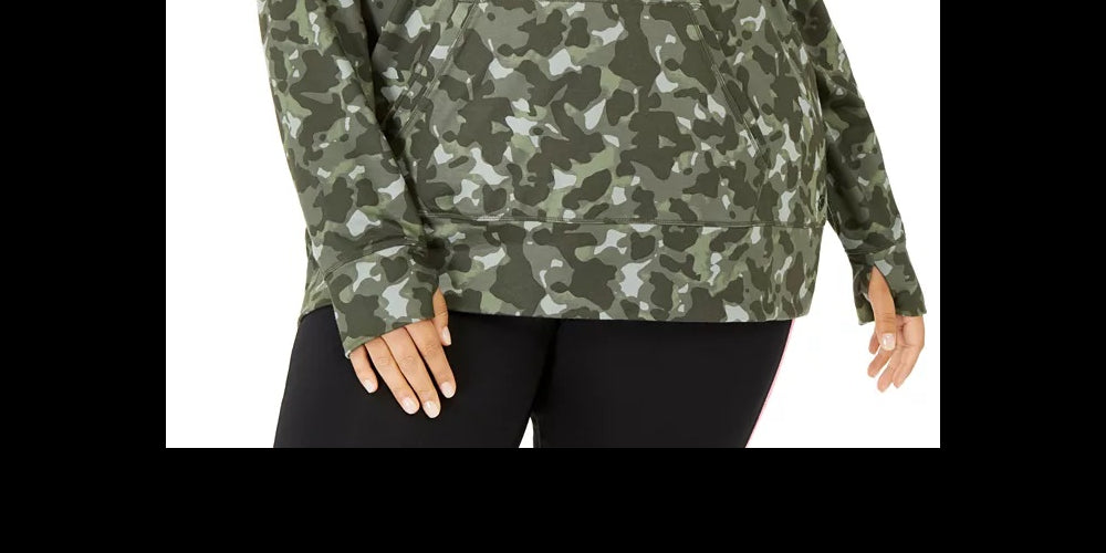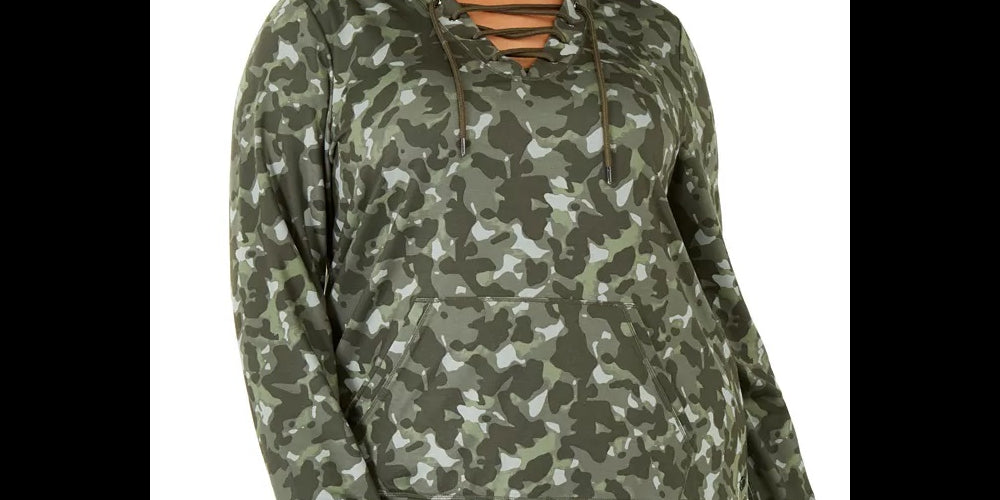Crewneck with attached hood; lace-up drawstring yoke|Kangaroo pocket at front|Thumbholes in sleeves|Polyester/rayon/spandex|Machine washable