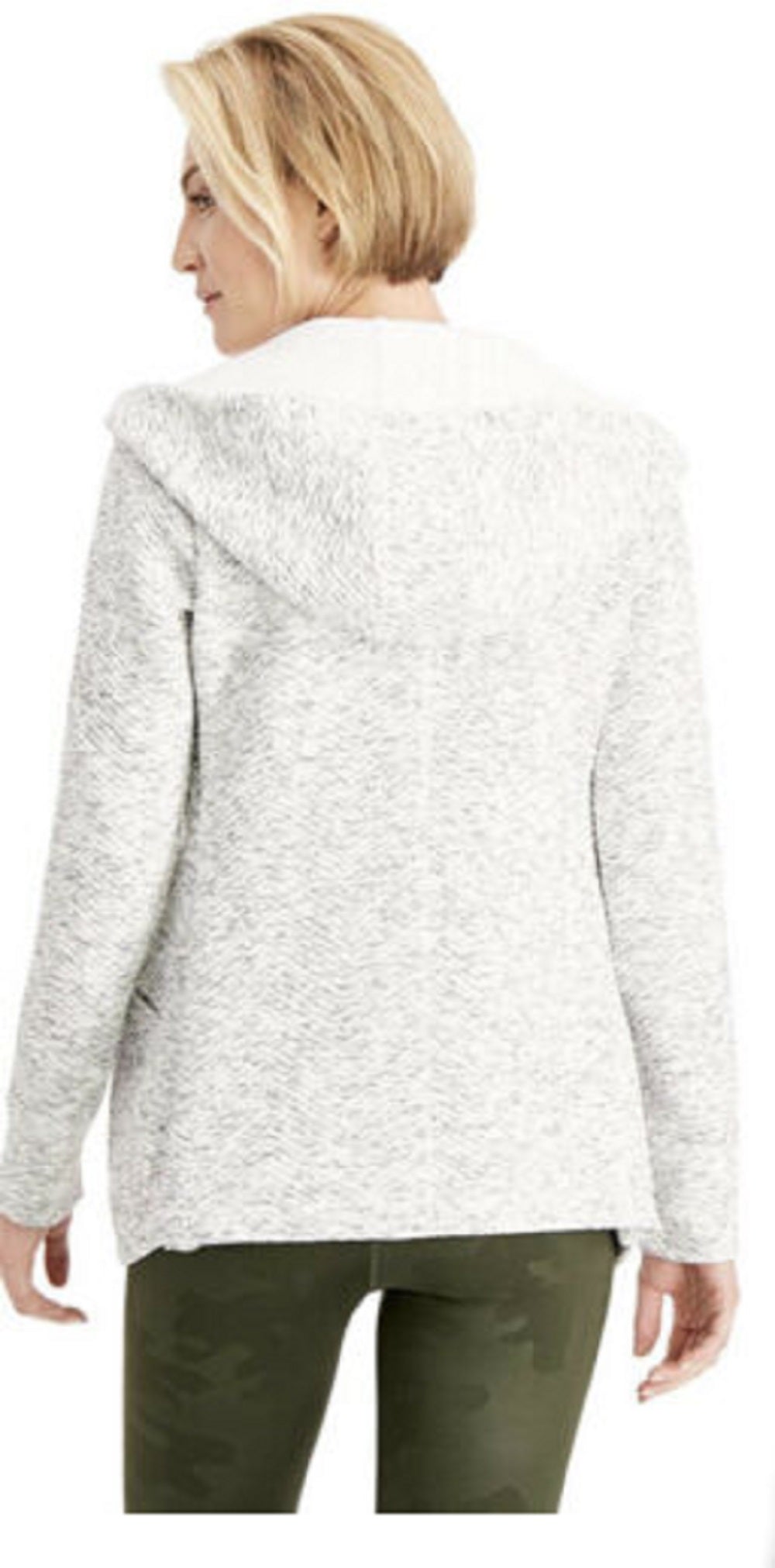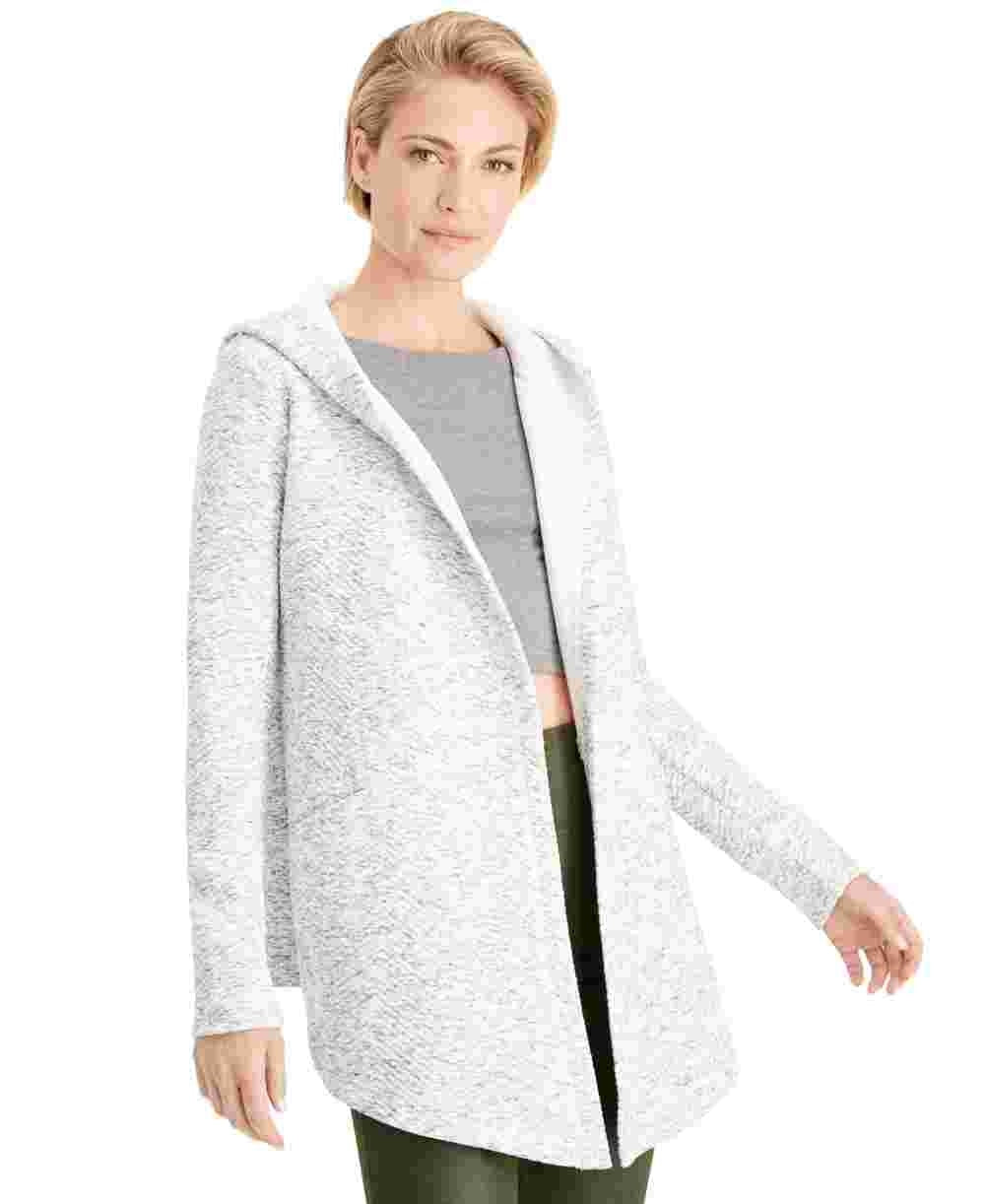 Semi-fitted|Attached hood; open front with no closure; pockets at sides|Polyester/spandex/rayon|Machine washable
