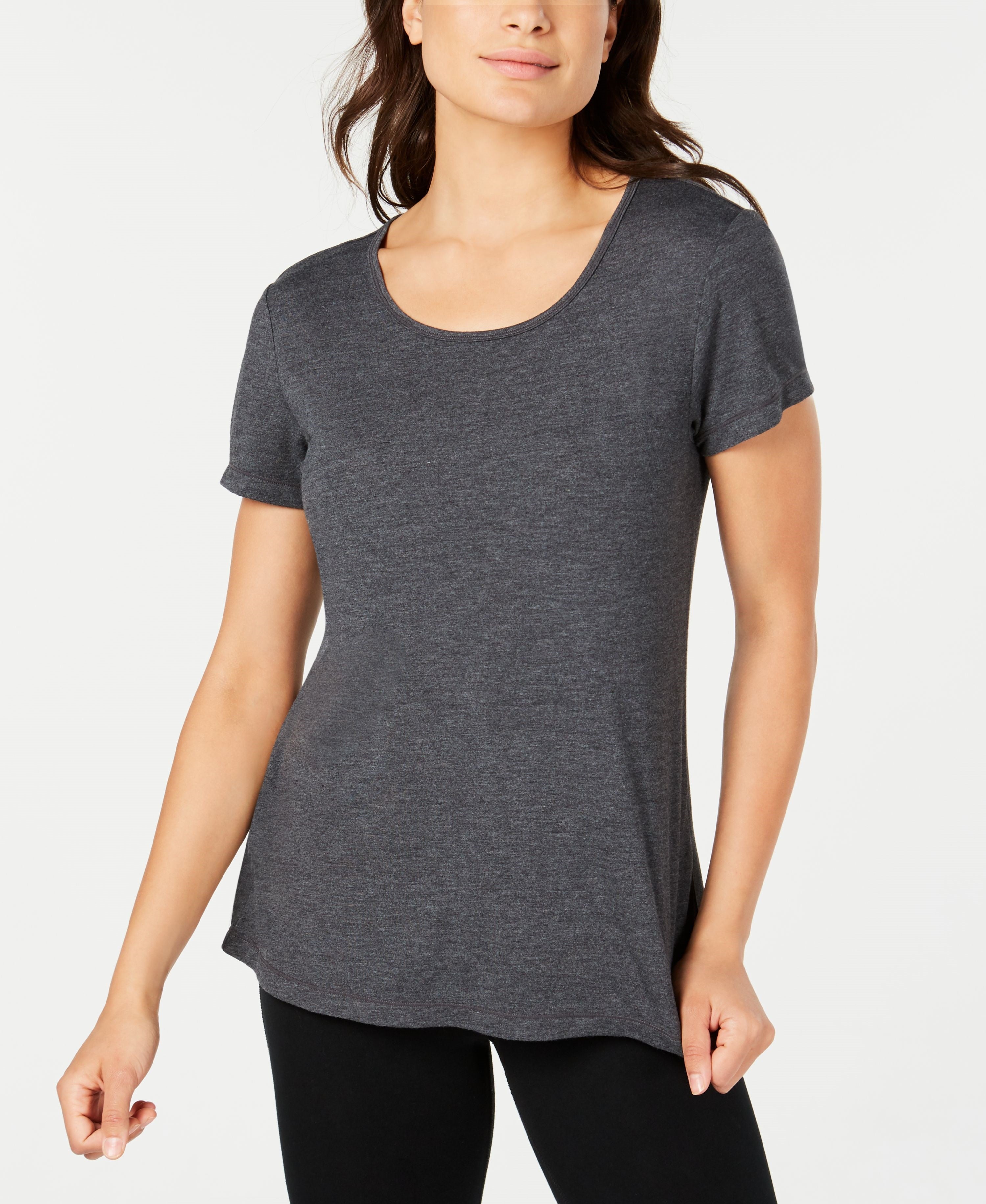 Hits at hip; semi-fitted; split back|INSPIRED FOR: Workout|Wicking technology helps evaporate moisture|Scoop neckline|Polyester/rayon