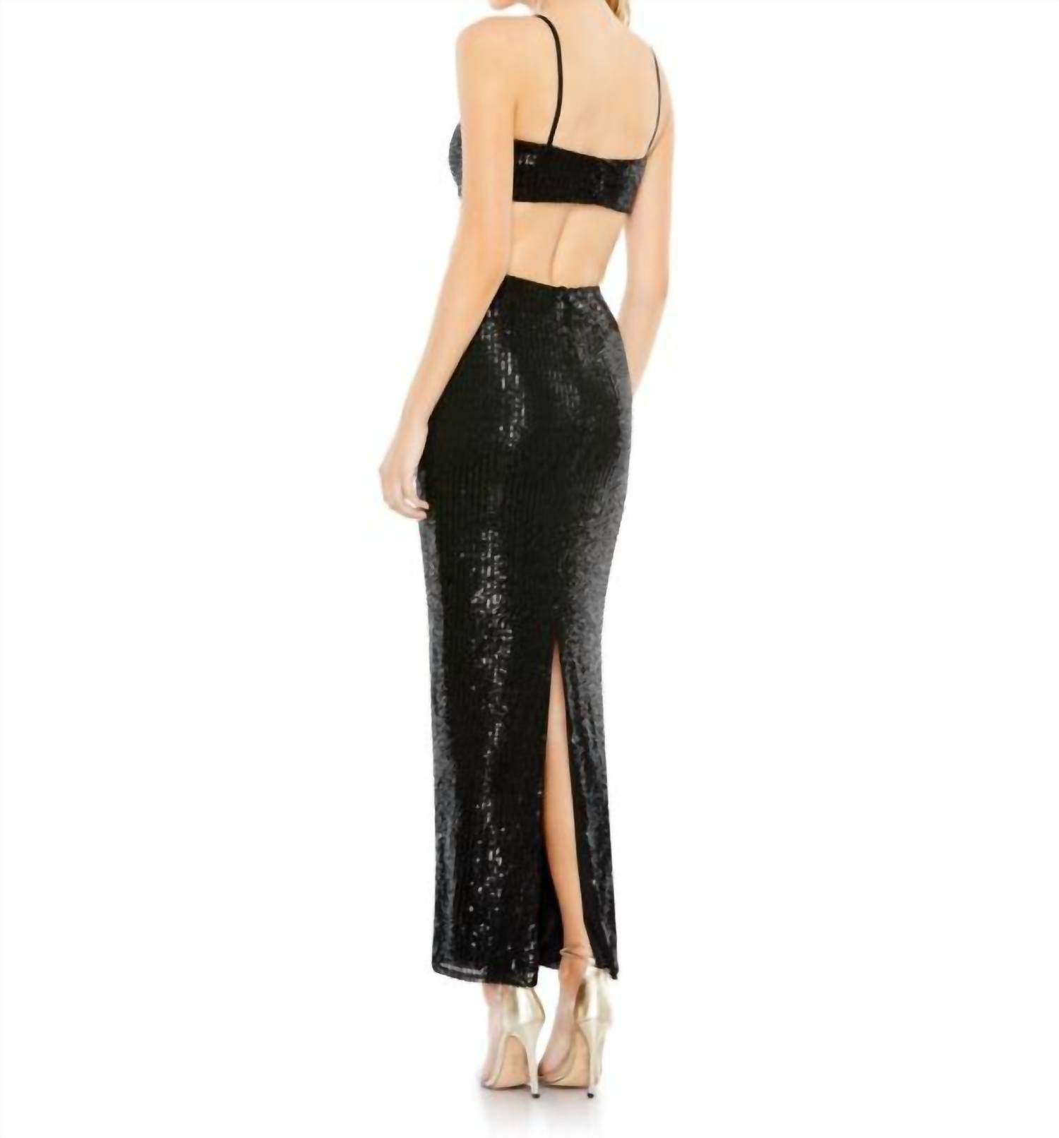 Elevate your evening wardrobe with the Cutout Waist Sequin Midi Dress by Ieena for Mac Duggal, a stunning piece in classic black. This sleeveless dress features a V-neckline and intricate beading with hand-stitched sequins on its mesh overlay, beautifully enhanced by a delicate hand-beaded belt at the natural waist. Crafted from 100% polyester, it offers a dramatic sheath silhouette and lace-up corset back, measuring approximately 62.5" from shoulder to hem. It closes with a concealed back zipper and requires spot cleaning.