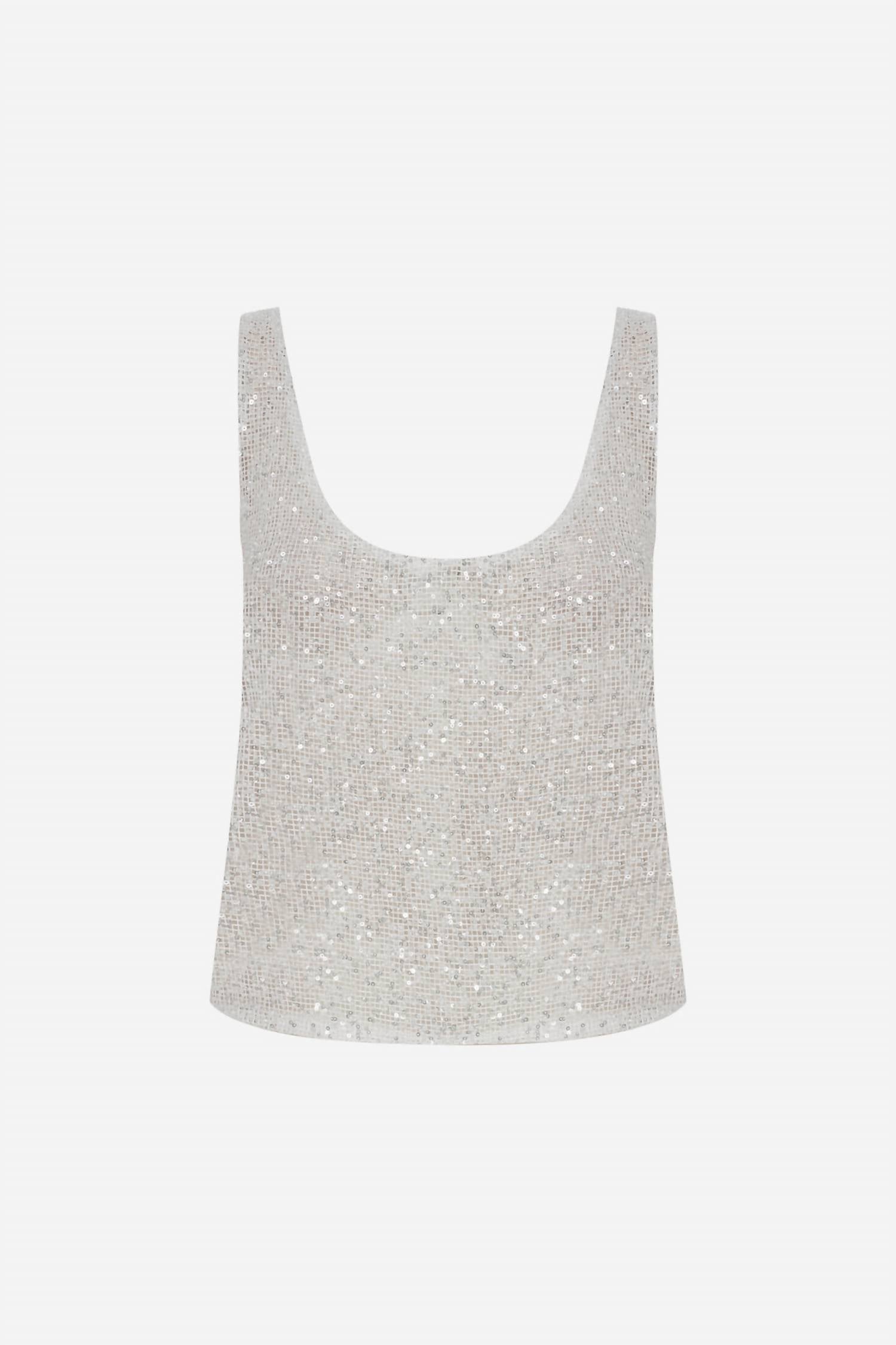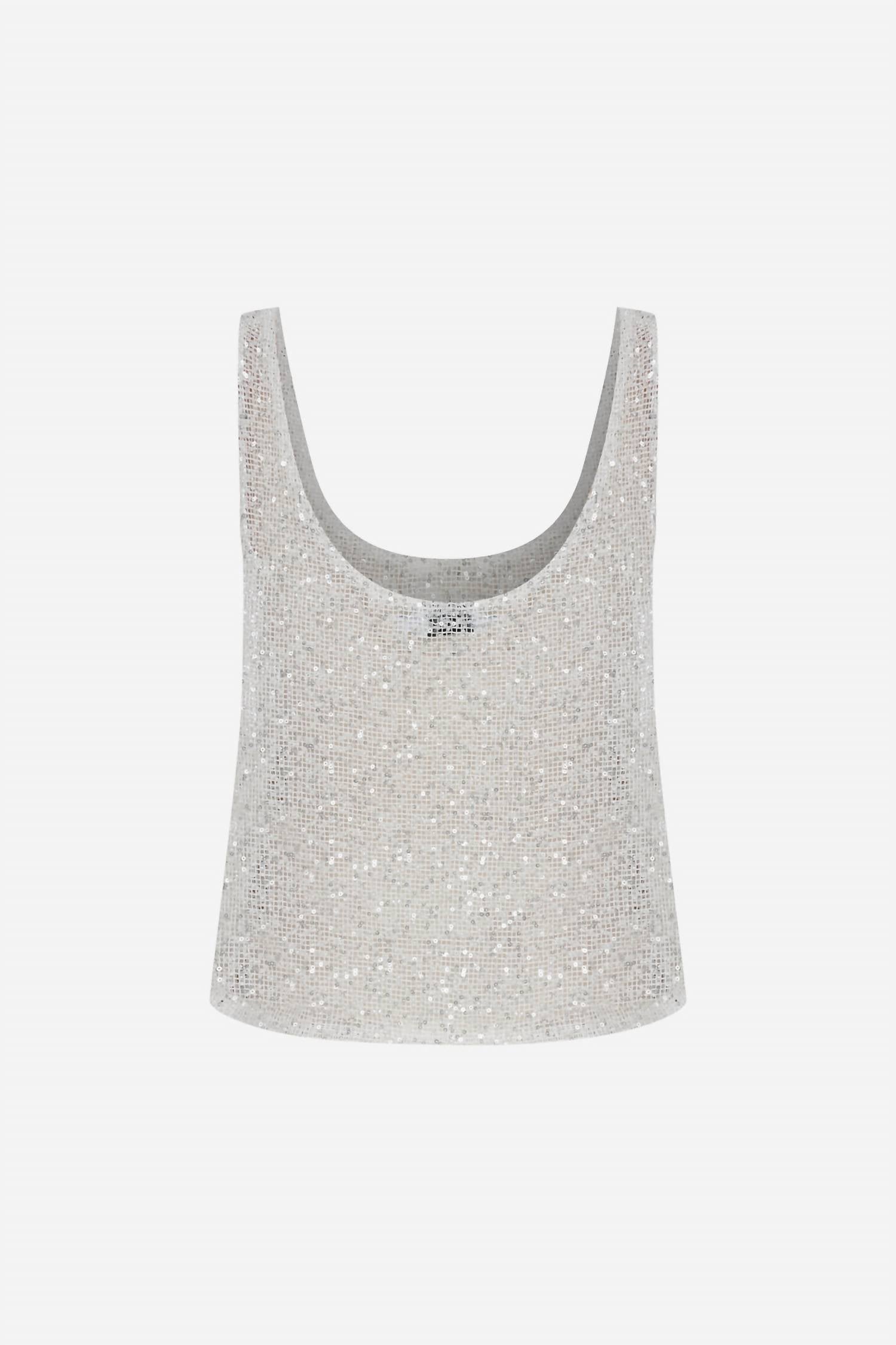 Make a statement with the ILA Lend U Neck Sequin Tank Top in crisp white, designed for women who love effortless elegance. This sleeveless tank top showcases a scoopneck and is crafted from 100% polyester material. The garment measures 12.5 inches in length with a comfortable pull-on closure for easy wear. Dry clean only. The model, standing at 175 cm, wears a size 34 EU; for an oversize fit, we recommend your true size.