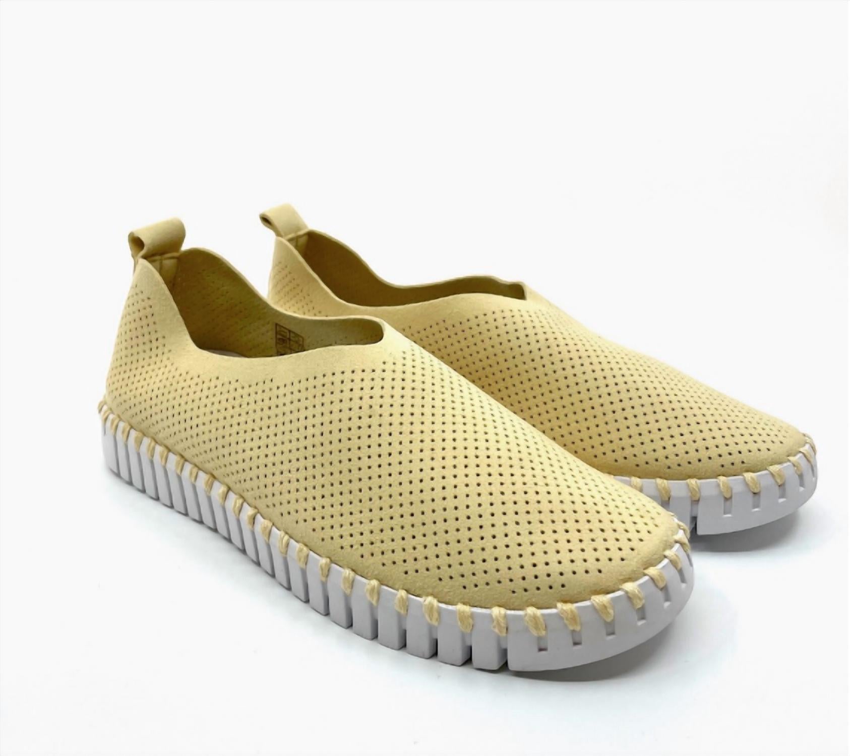 This shoe features a breathable upper made from recycled microfiber, paired with a signature tulip-shaped outsole in a matching color. The outsole is crafted from 75% natural rubber and 25% recycled rubber, stitched together with matching recycled thread—no glue used. Inside, the padded insole is lined with soft pig suede for added comfort and support.
