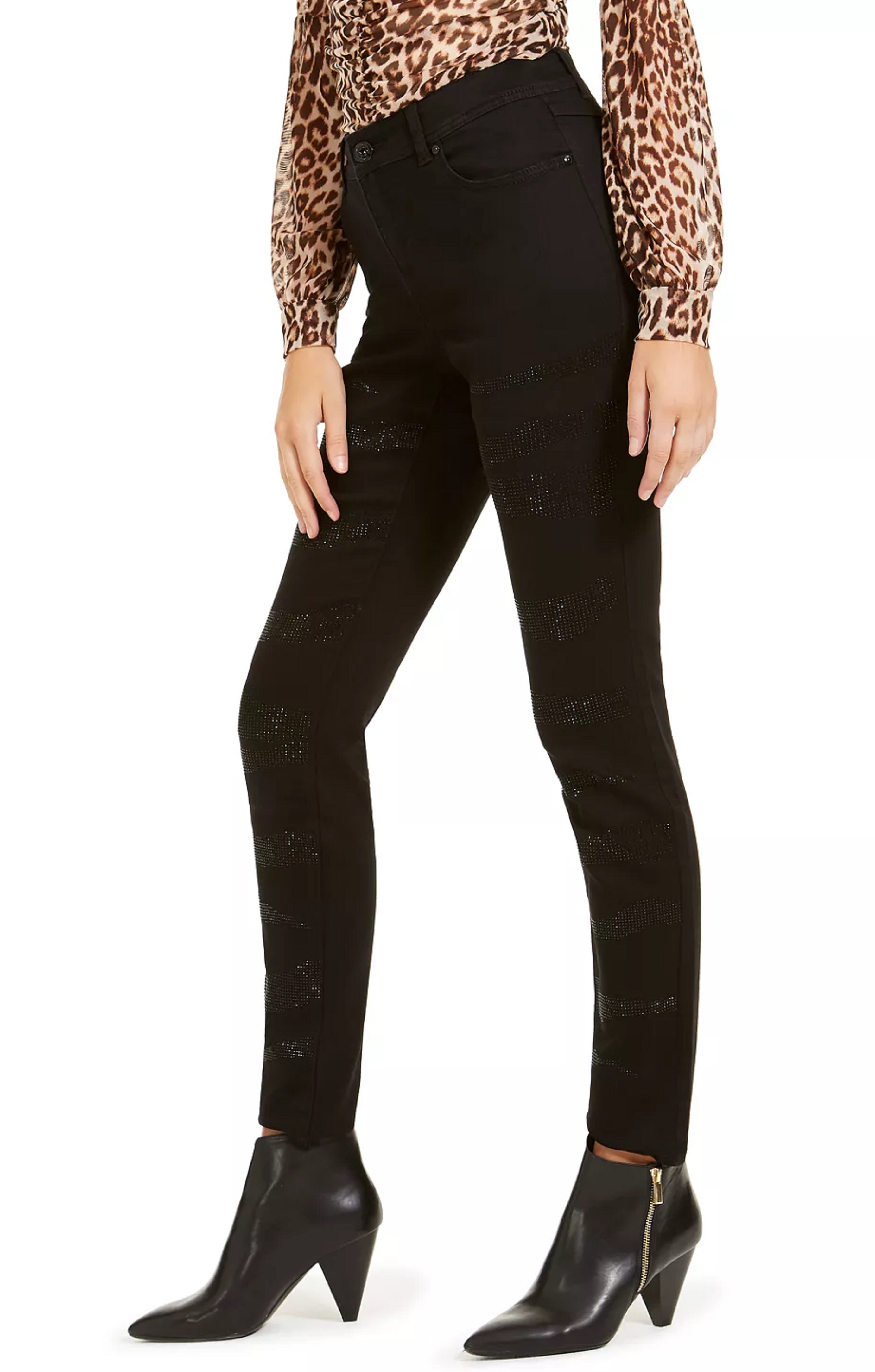 Approx. inseam 31 long|Mid rise; curvy fit|Zipper and button closure at front; belt loops|Rhinestone zebra-stripe embellishments|Cotton/polyester/spandex