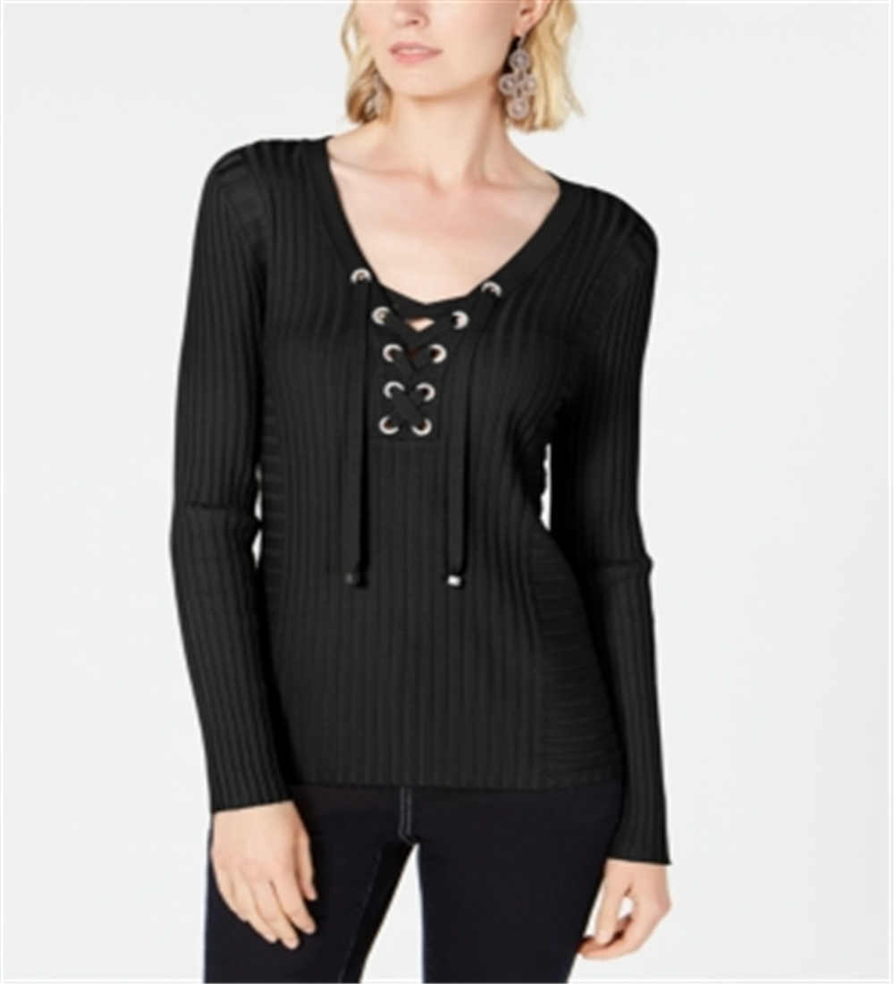 INC International Concepts Women's Lace up Ribbed Knit Sweater Black Size Petite S
