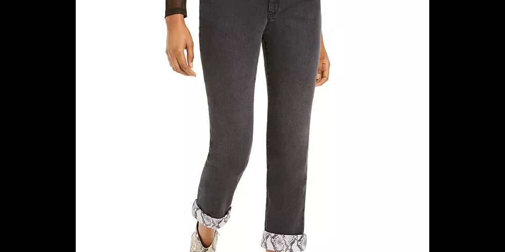 Approx. inseam 30 long|Mid rise|Zipper and button closure at front; belt loops|Snake-print cuffs|Cotton/polyester/viscose/elastane