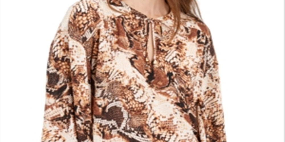 INC Women's Snake Print Tie Neck Peasant Top Brown Size Large