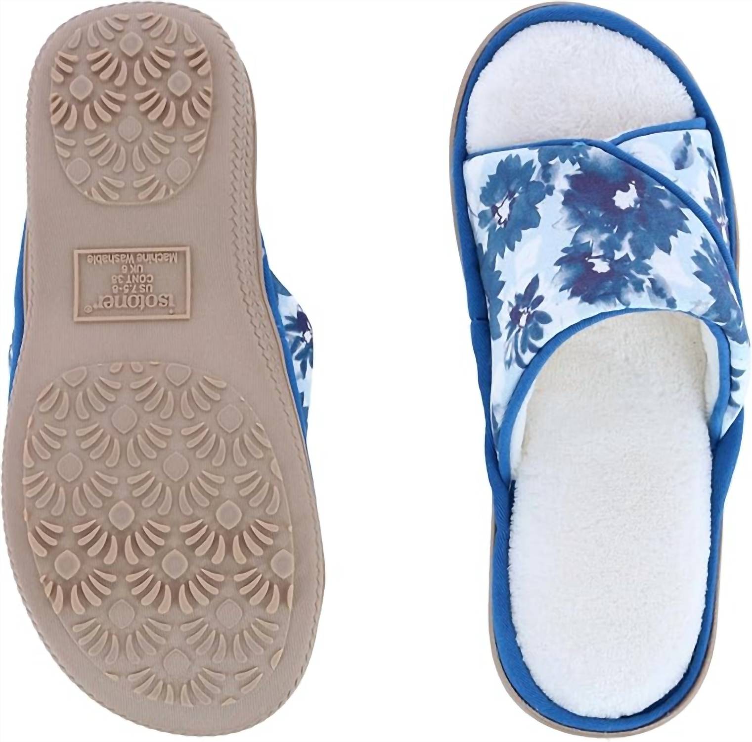 Slip into these, we promise you won't regret it. Step into comfort with the Women's Cotton Floral Keilly Slide by Isotoner, designed in an enchanting Island Blue hue perfect for summer. Crafted with soft organic cotton and recycled microterry lining, these slides feature enhanced heel cushions for all-day support, while the plush memory foam footbeds offer personalized comfort. The versatile indoor/outdoor soles and moisture-wicking materials ensure that your feet stay cool and dry during your travels or 4th of July celebrations.