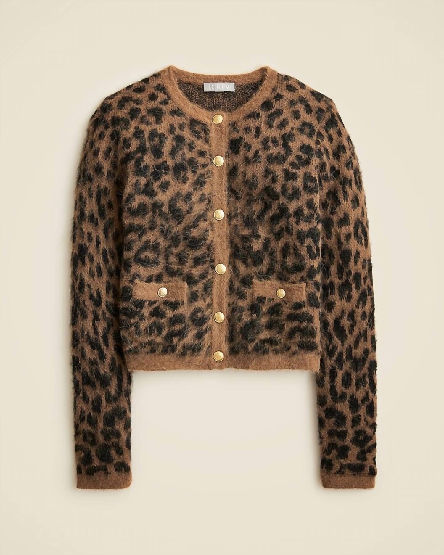 Enhance your wardrobe with the Brushed Sweater Lady Jacket by J.Crew, featuring a luxe long sleeve design in timeless leopard print. Crafted from a premium blend of 40% polyamide, 30% acrylic, 15% alpaca, and 15% wool, this cropped piece offers both comfort and style, measuring 19" in length. Originating from China, it includes a button closure and convenient pockets for practicality. For care, hand wash and lay flat to dry to maintain its polished look.