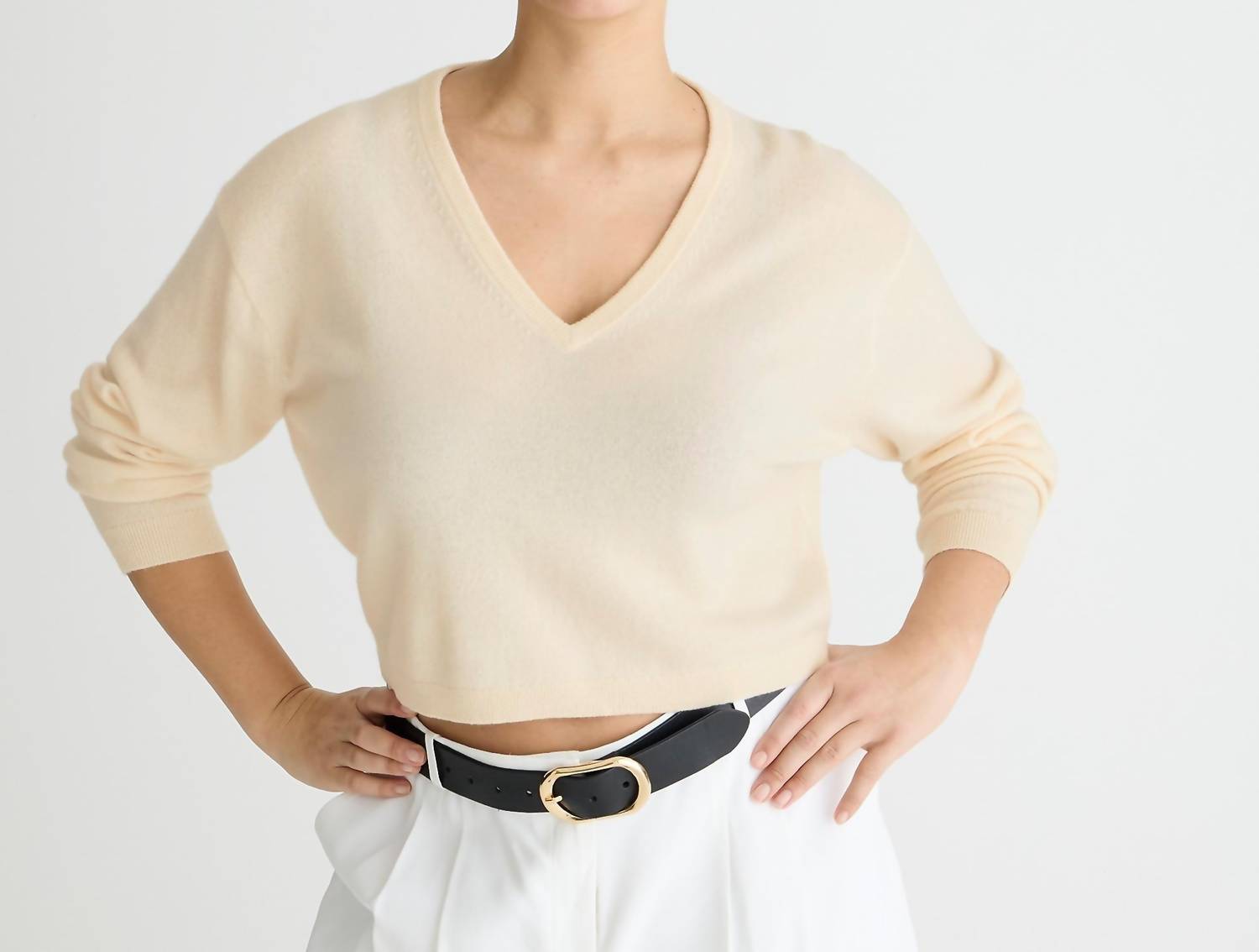 Introducing the J.Crew Cashmere Relaxed Cropped V-neck Sweater in Heather Muslin, a perfect layering piece with a slightly shorter fit. This solid V-neck sweater features long sleeves and is crafted from 100% cashmere sourced responsibly through The Good Cashmere Standard®. Closure: Pull on style. Care: Hand wash and lay flat to dry. Garment length: 19.5 inches, sleeve length: 29.75 inches, designed to hit slightly above the hip. Made in China.