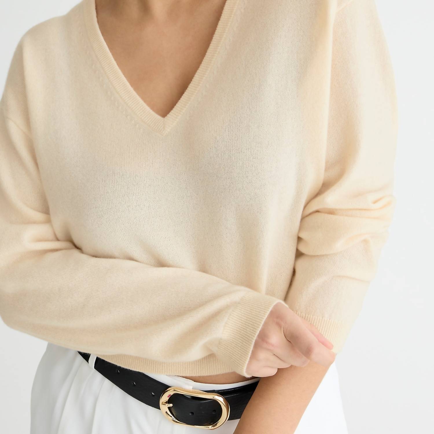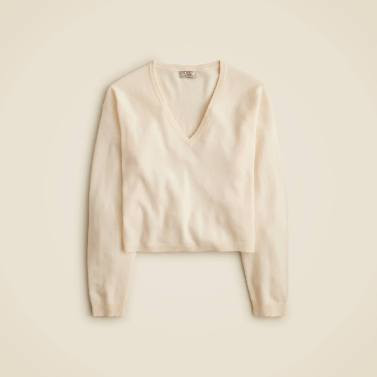 Wear this v-neck sweater with your favorite denim for the perfect fall look. Introducing the J.Crew Cashmere Relaxed Cropped V-neck Sweater in Heather Muslin, a perfect layering piece with a slightly shorter fit. This solid V-neck sweater features long sleeves and is crafted from 100% cashmere sourced responsibly through The Good Cashmere Standard®. Closure: Pull on style. Care: Hand wash and lay flat to dry. Garment length: 19.5 inches, sleeve length: 29.75 inches, designed to hit slightly above the hip. Made in China.